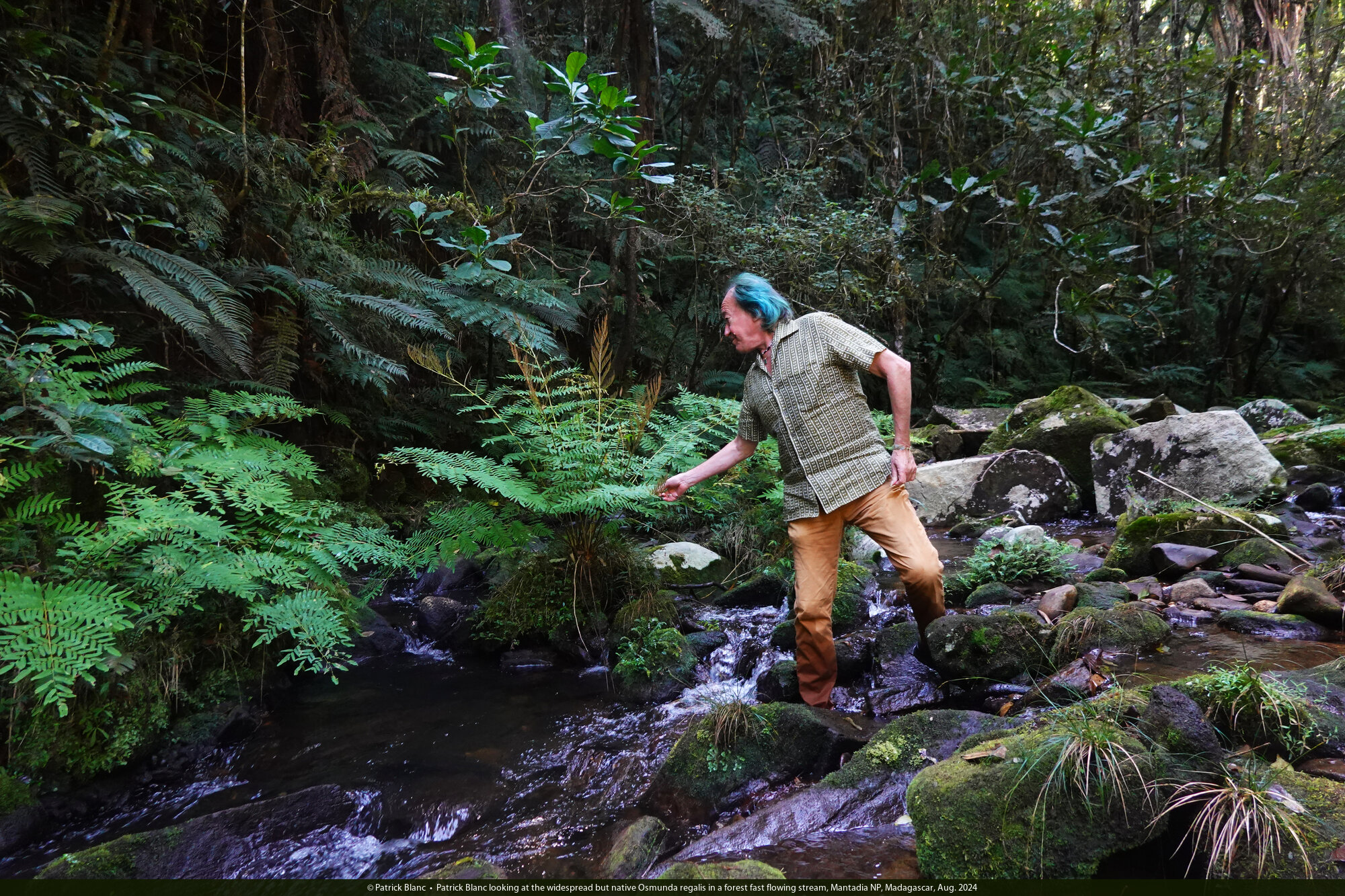 Patrick Blanc looking at the widespread but native Osmunda regalis in a forest fast flowing stream, Mantadia NP, Madagascar, Aug. 2024