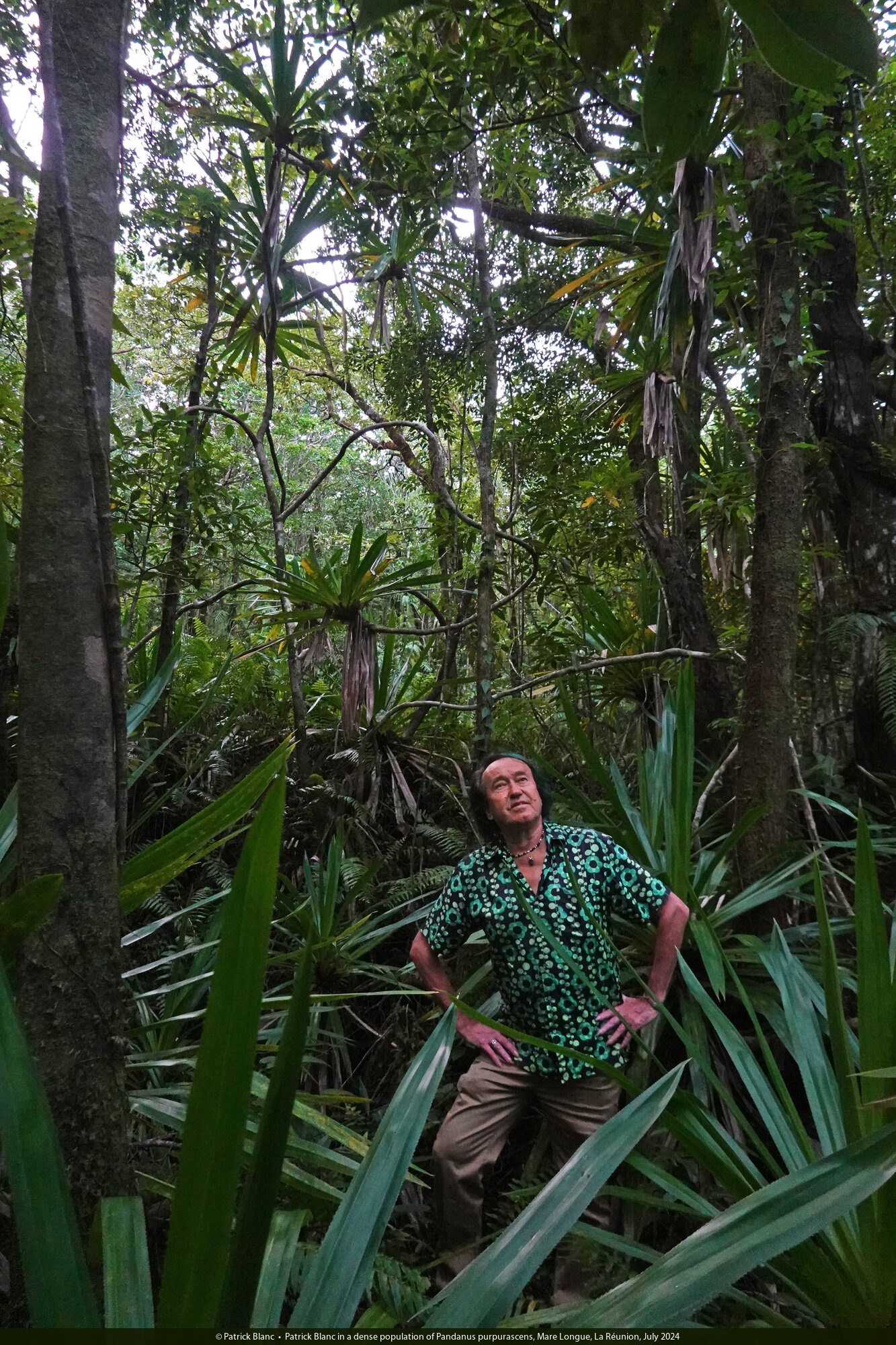 Patrick Blanc in a dense population of Pandanus purpurascens, Mare Longue, La Réunion, July 2024