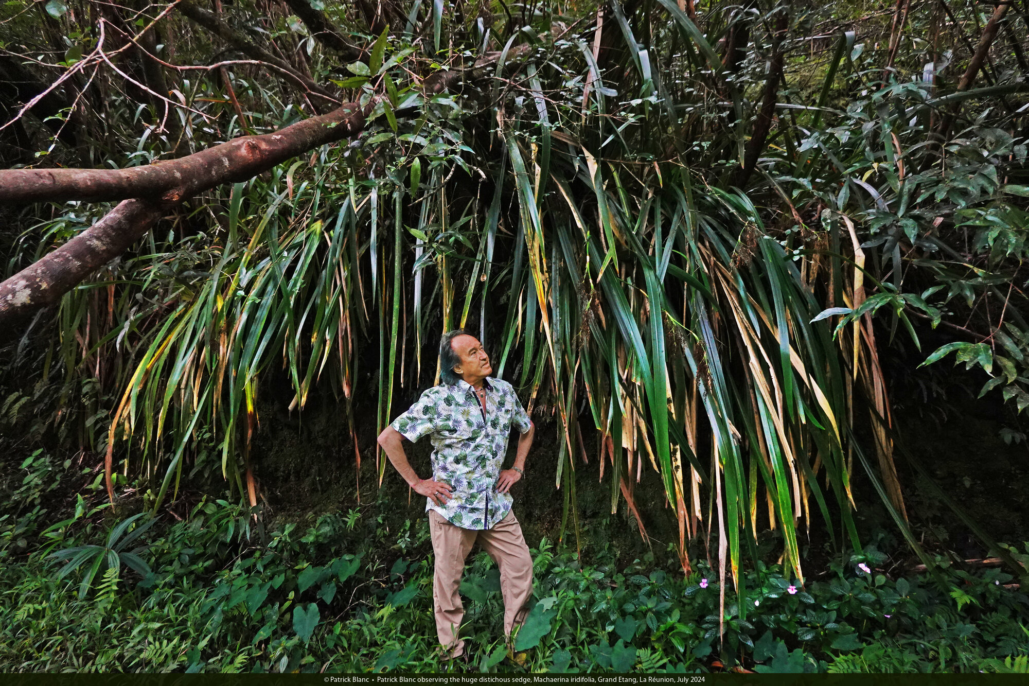 Patrick Blanc observing the huge distichous sedge, Machaerina iridifolia, Grand Etang, La Réunion, July 2024