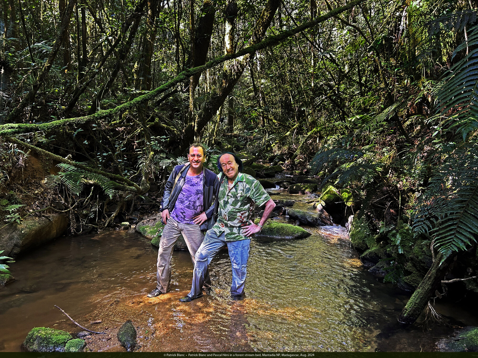 Patrick Blanc and Pascal Héni in a forest stream bed, Mantadia NP, Madagascar, Aug. 2024