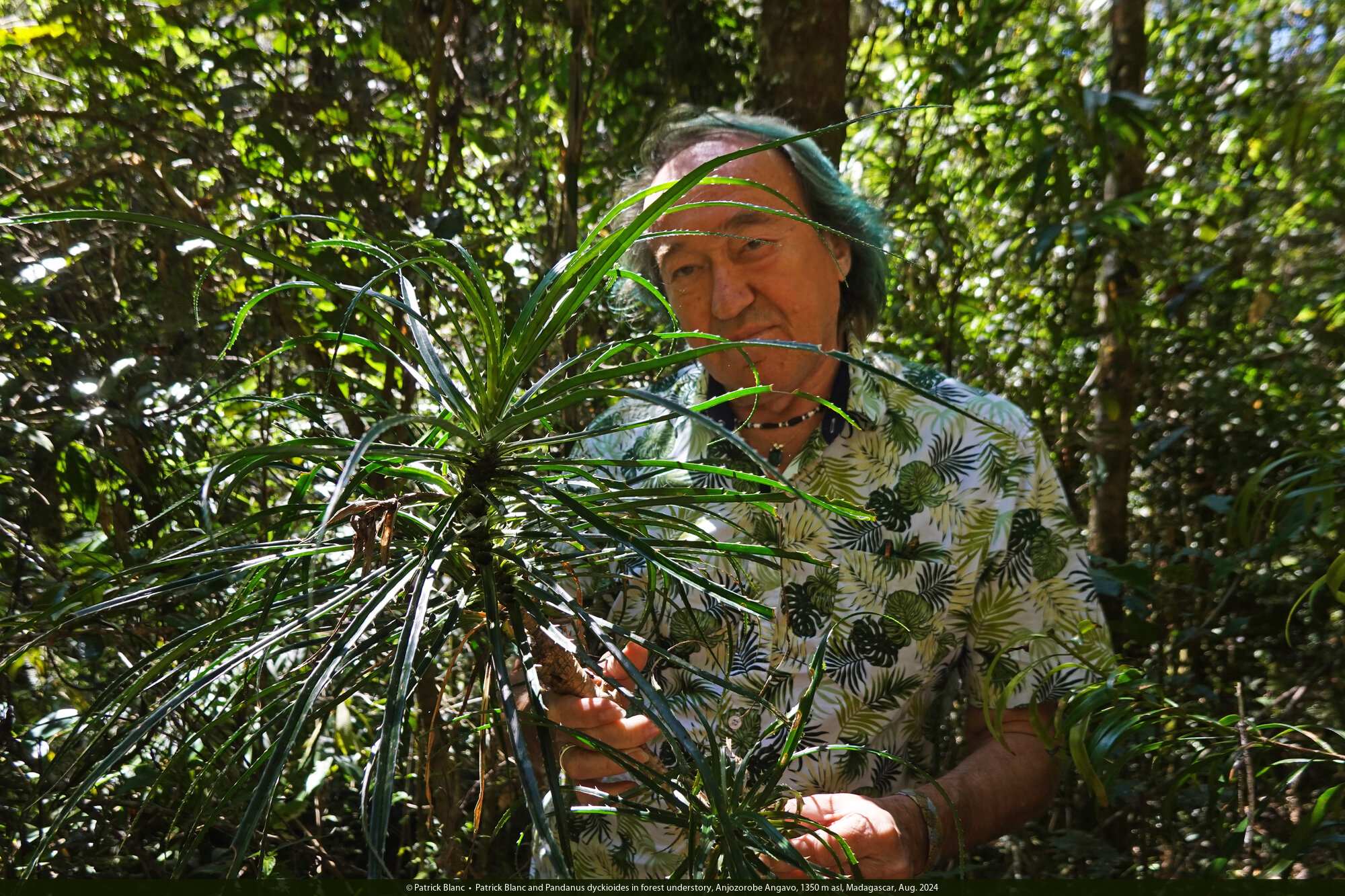 Patrick Blanc among the huge leaves of Pandanus cf. pulcher during its young monocaulous stage in forest understory, Anamalazaotra FR, Madagascar, Aug 2024