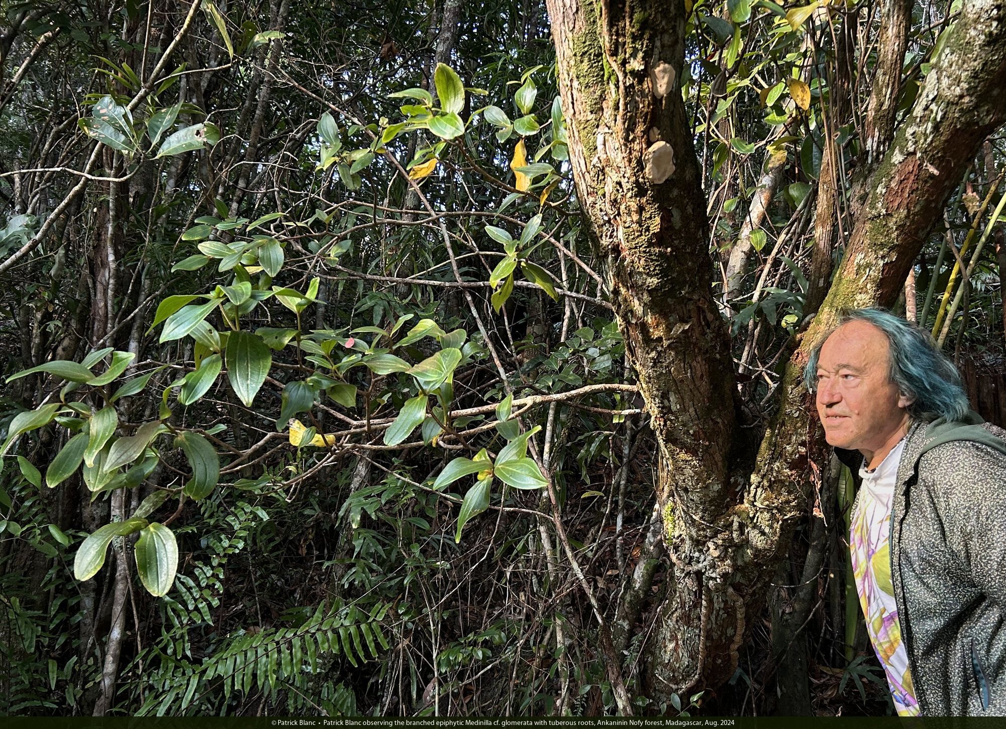 Patrick Blanc observing the branched epiphytic Medinilla cf. glomerata with tuberous roots, Ankaninin Nofy forest, Madagascar, Aug. 2024