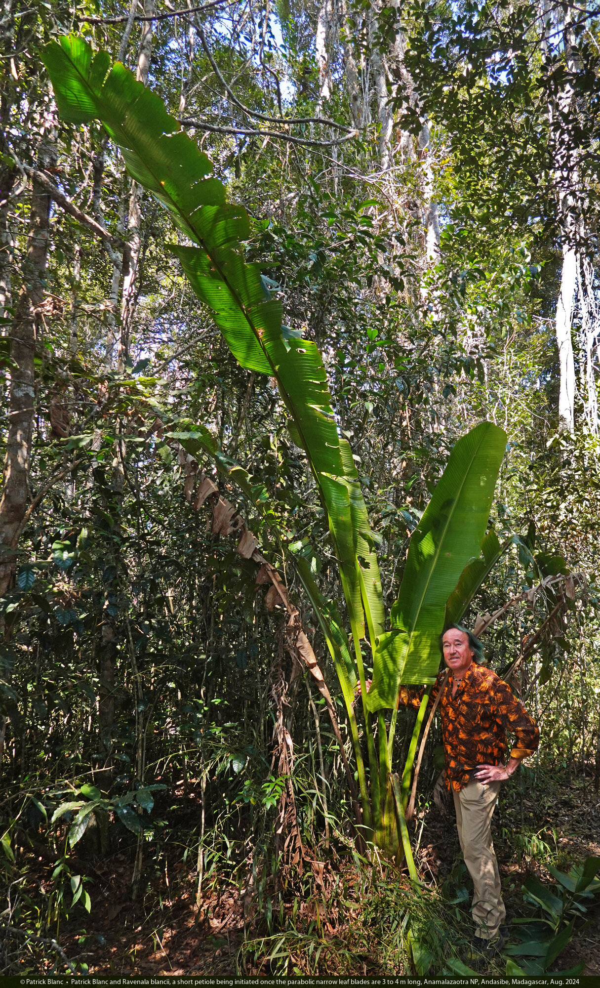 Patrick Blanc and Ravenala blancii, a short petiole being initiated once the parabolic narrow leaf blades are 3 to 4 m long, Anamalazaotra NP, Andasibe, Madagascar, Aug. 2024
