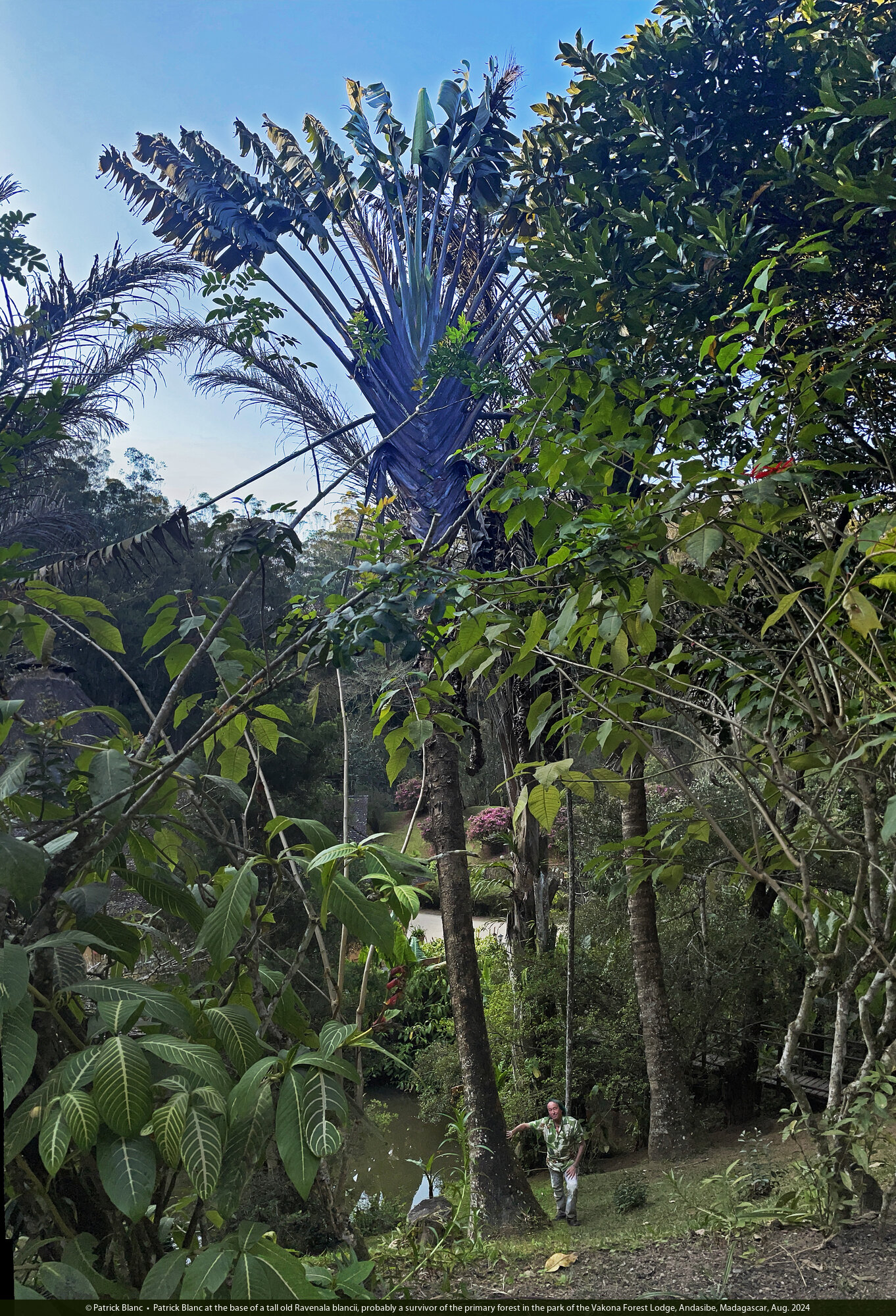 Patrick Blanc at the base of a tall old Ravenala blancii, probably a survivor of the primary forest in the park of the Vakona Forest Lodge, Andasibe, Madagascar, Aug. 2024