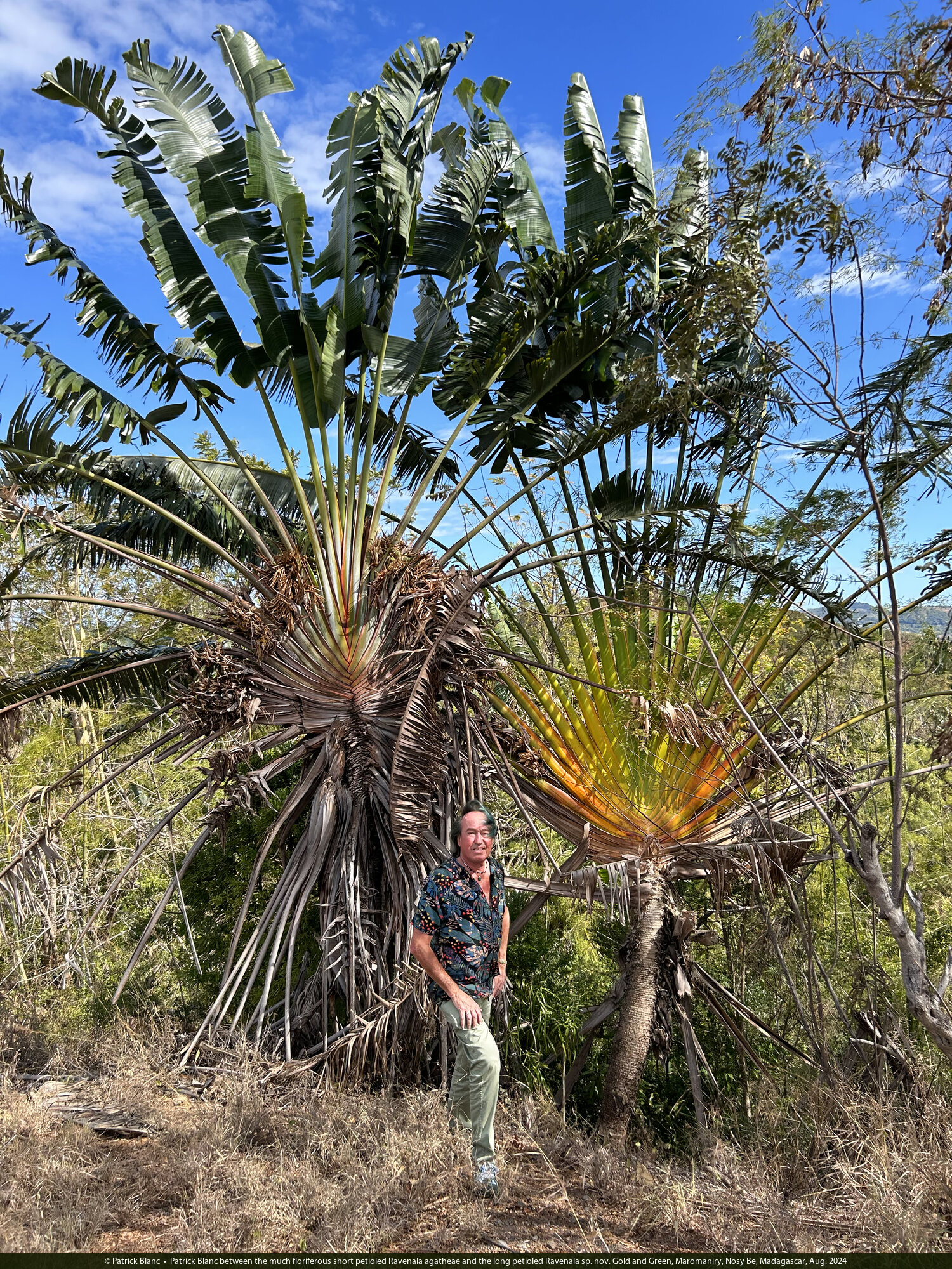 Patrick Blanc between the much floriferous short petioled Ravenala agatheae and the long petioled Ravenala sp. nov. Gold and Green, Maromaniry, Nosy Be, Madagascar, Aug. 2024