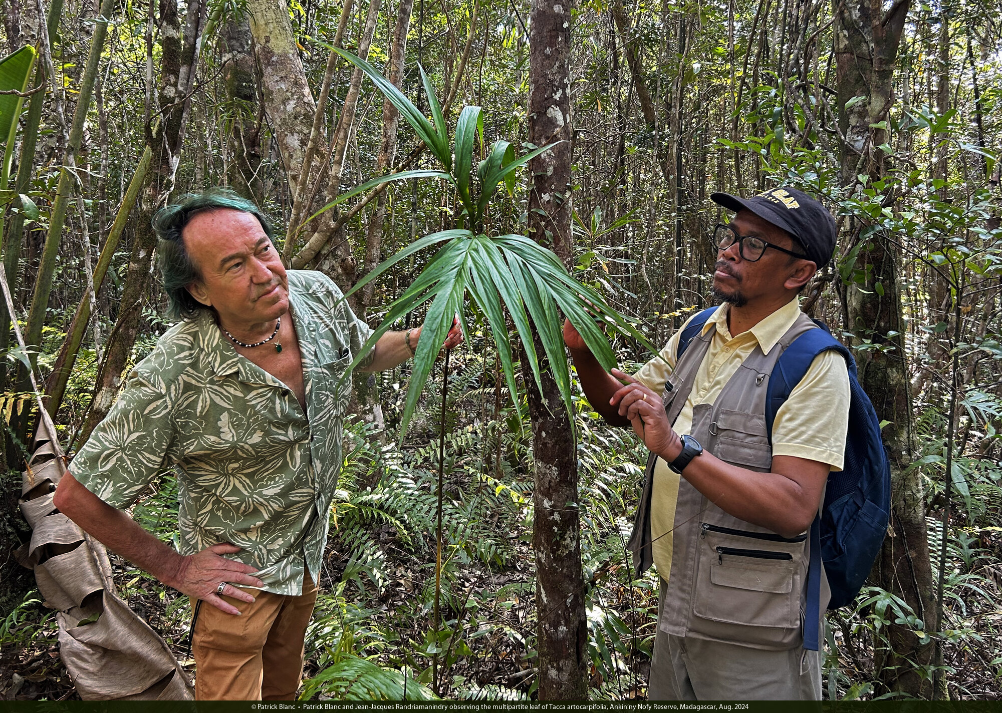 Patrick Blanc observing the deeply dissected narrow lobes of the pedate multipartite leaf of Tacca artocarpifolia, Anjozorobe Angavo, Madagascar, Aug. 2024