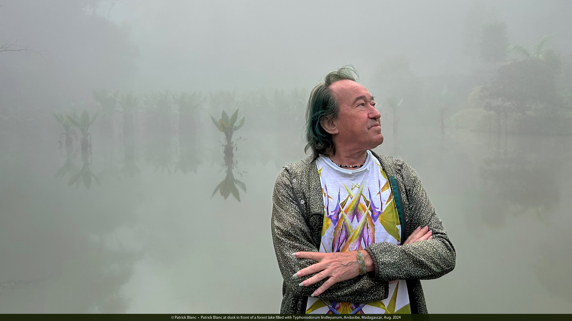 Patrick Blanc at dusk in front of a forest lake filled with Typhonodorum lindleyanum, Andasibe, Madagascar, Aug. 2024