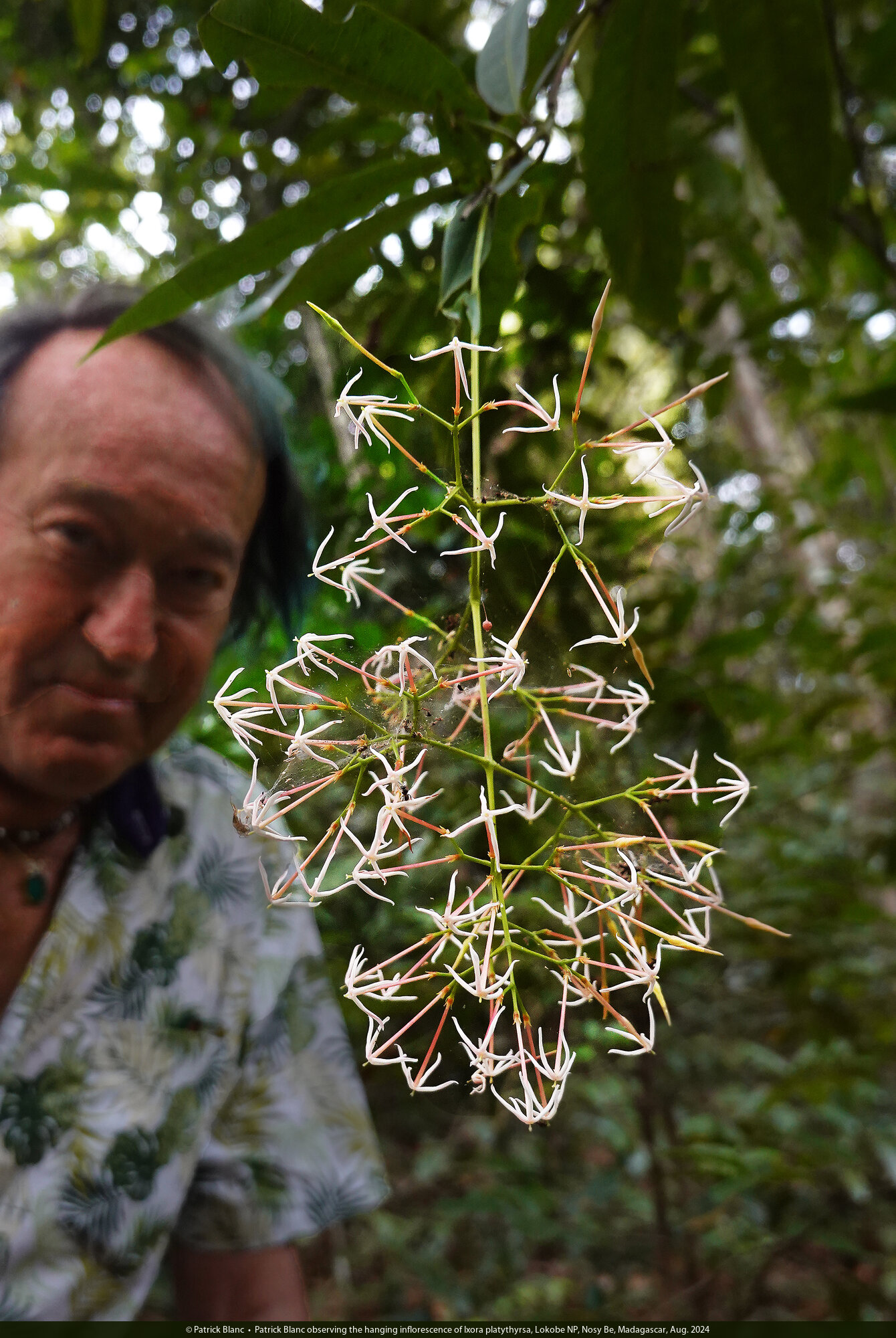 Patrick Blanc observing the hanging inflorescence of Ixora platythyrsa, Lokobe NP, Nosy Be, Madagascar, Aug. 2024