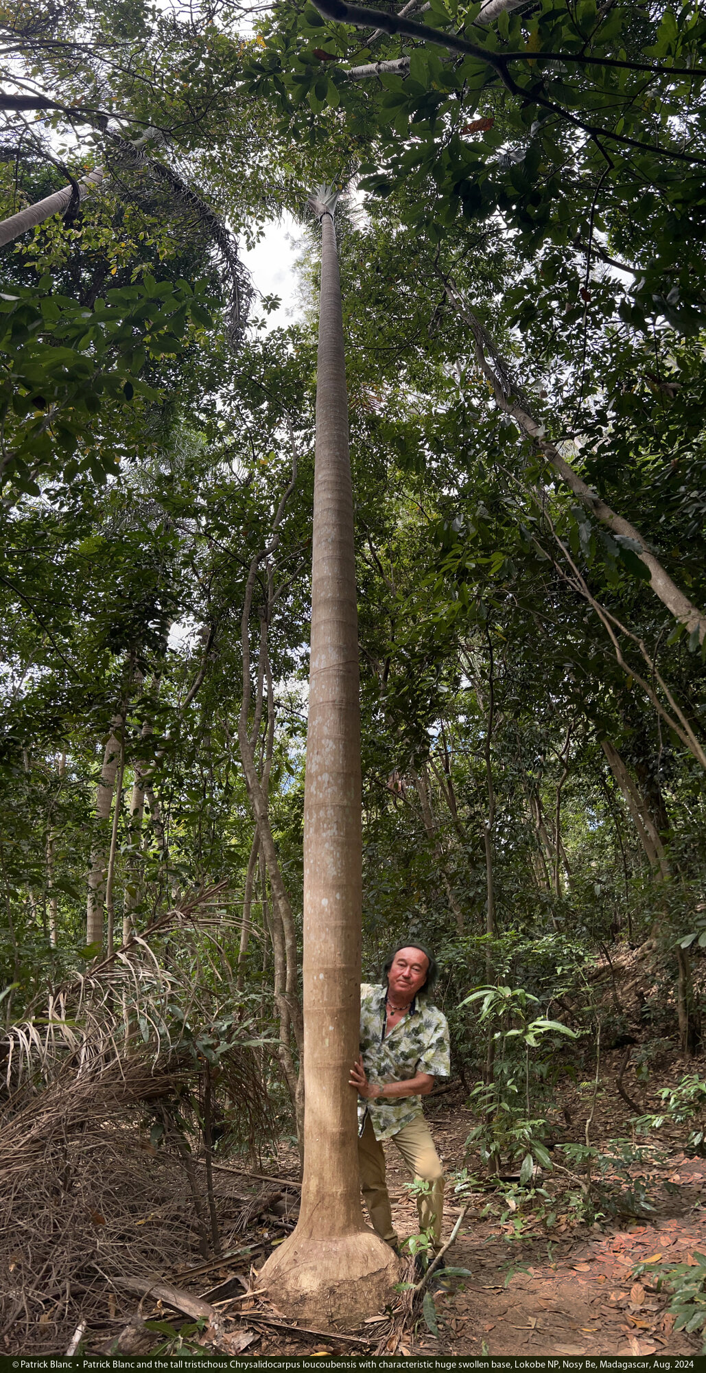 Patrick Blanc and the tall tristichous Chrysalidocarpus loucoubensis with characteristic huge swollen base, Lokobe NP, Nosy Be, Madagascar, Aug. 2024