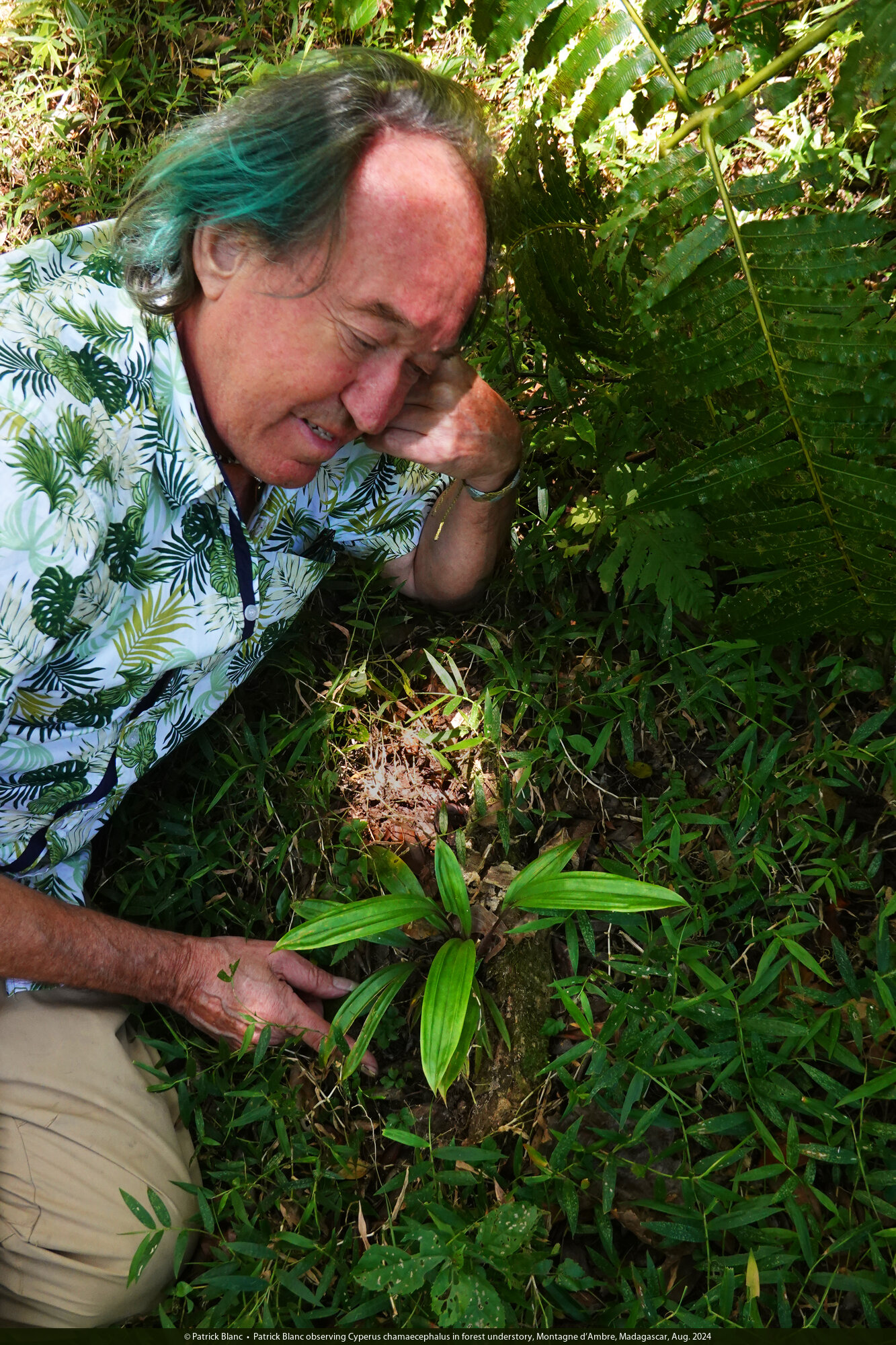 Patrick Blanc observing Cyperus chamaecephalus in forest understory, Montagne d'Ambre, Madagascar, Aug. 2024