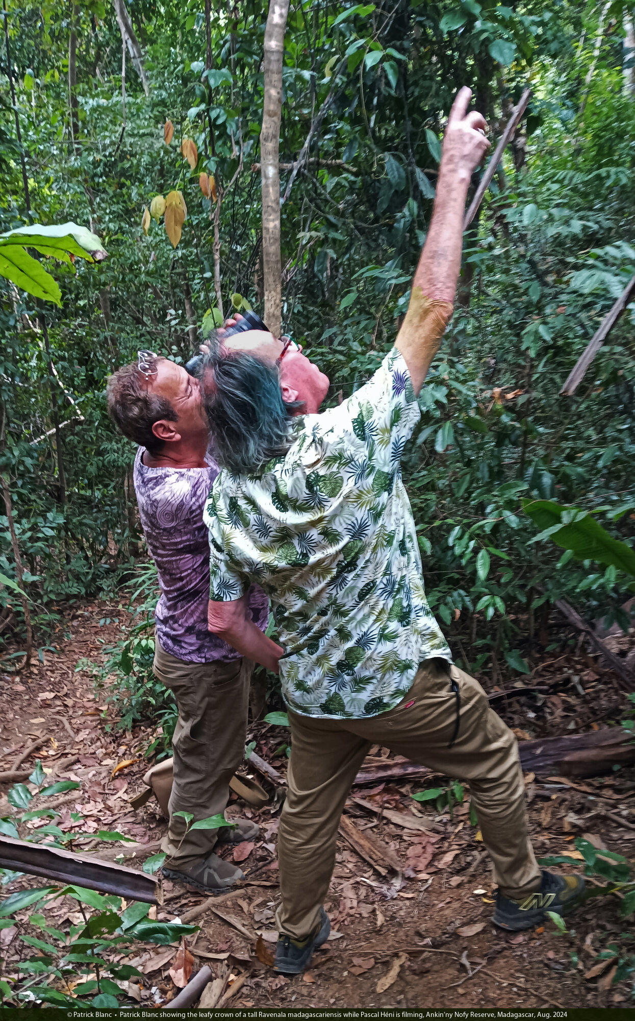 Patrick Blanc showing the leafy crown of a tall Ravenala madagascariensis while Pascal Héni is filming, Ankin'ny Nofy Reserve, Madagascar, Aug. 2024