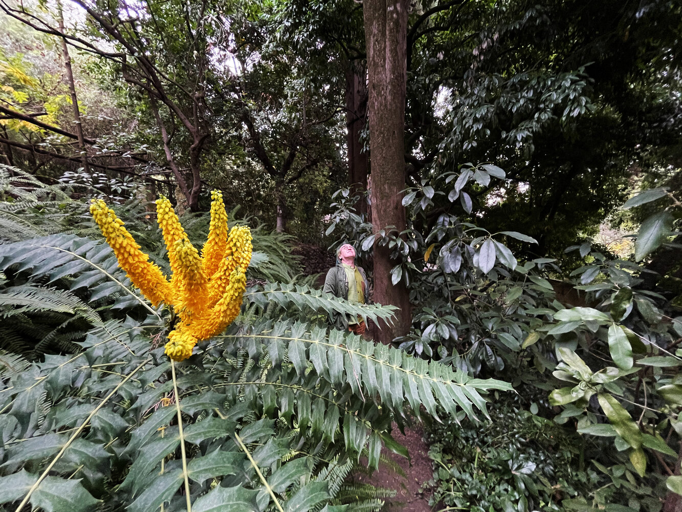 Patrick Blanc observing the bright yellow flowers of the introduced Distimake tuberosus, Le Ouaki, Saint Louis, La Réunion, July 2024