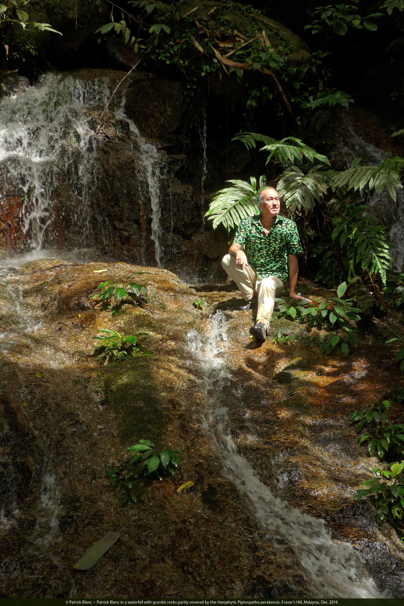 Patrick Blanc in a waterfall with granitic rocks partly covered by the rheophytic Piptospatha perakensis, Fraser's Hill, Malaysia, Dec. 2016