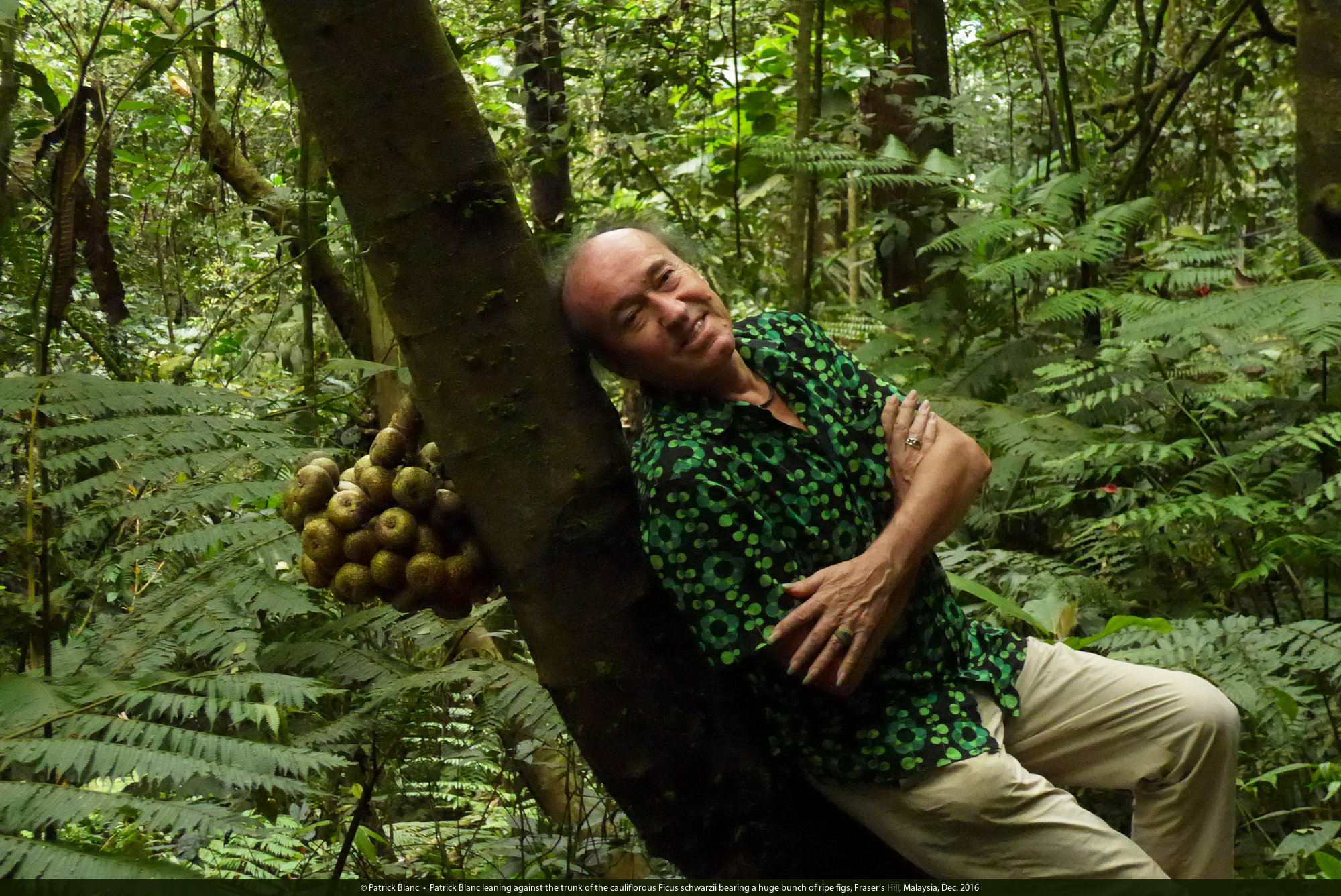 Patrick Blanc leaning against the trunk of the cauliflorous Ficus auriculata bearing huge bunches of ripe figs, Fraser's Hill, Malaysia, Dec. 2016