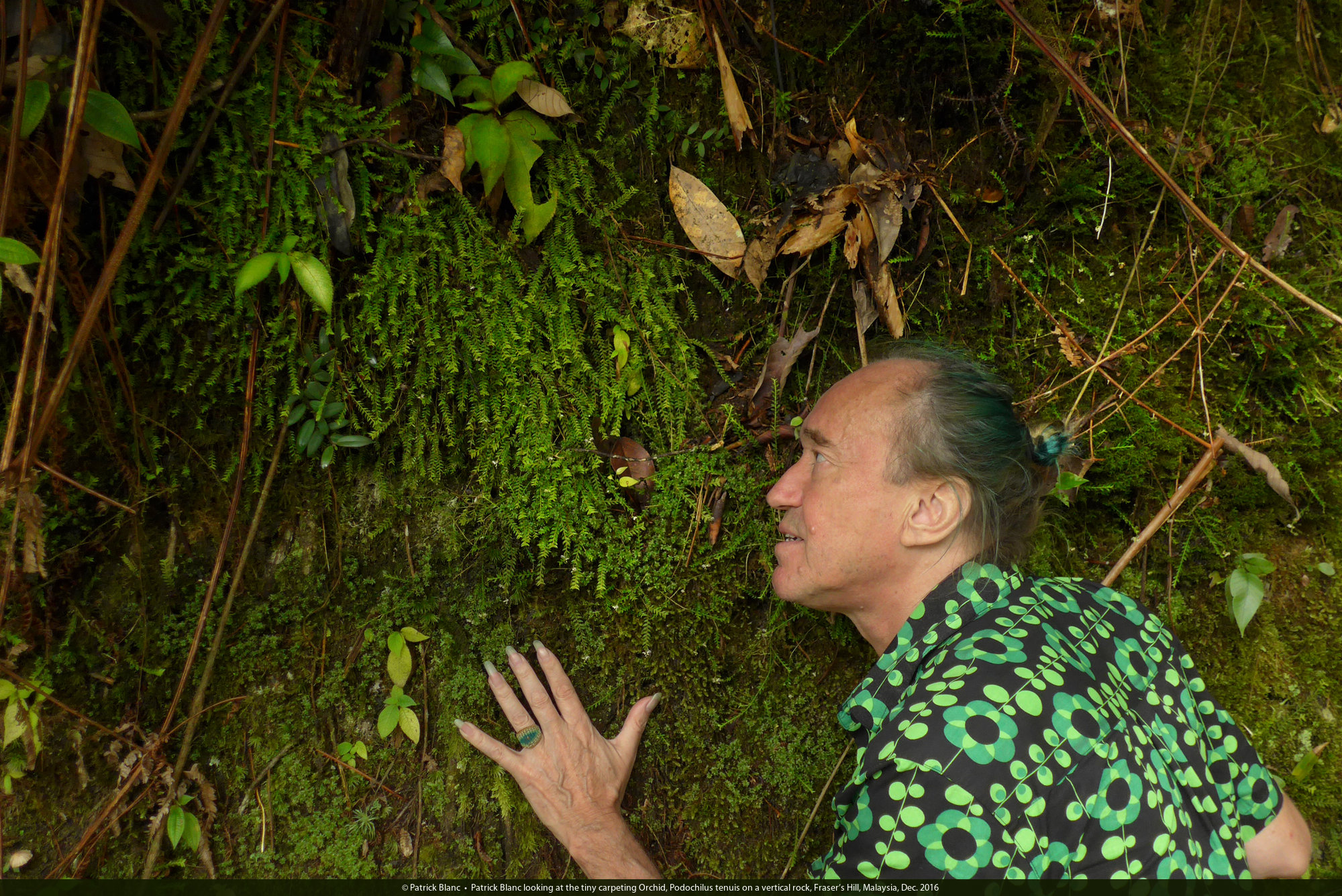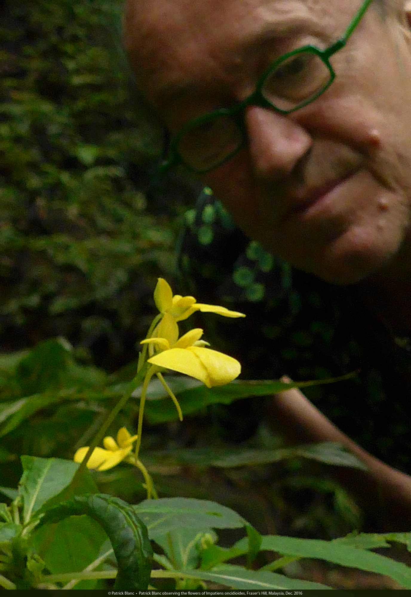 Patrick Blanc observing the flowers of Impatiens oncidioides, Fraser's Hill, Malaysia, Dec. 2016