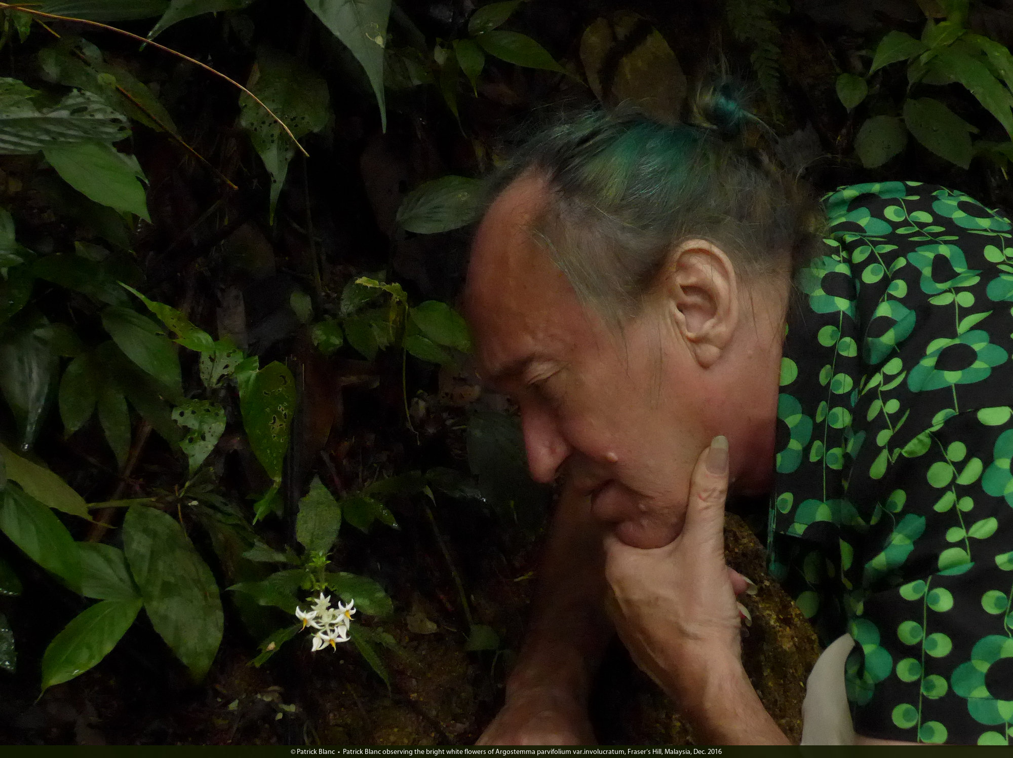 Patrick Blanc observing the bright white flowers of Argostemma parvifolium var.involucratum, Fraser's Hill, Malaysia, Dec. 2016