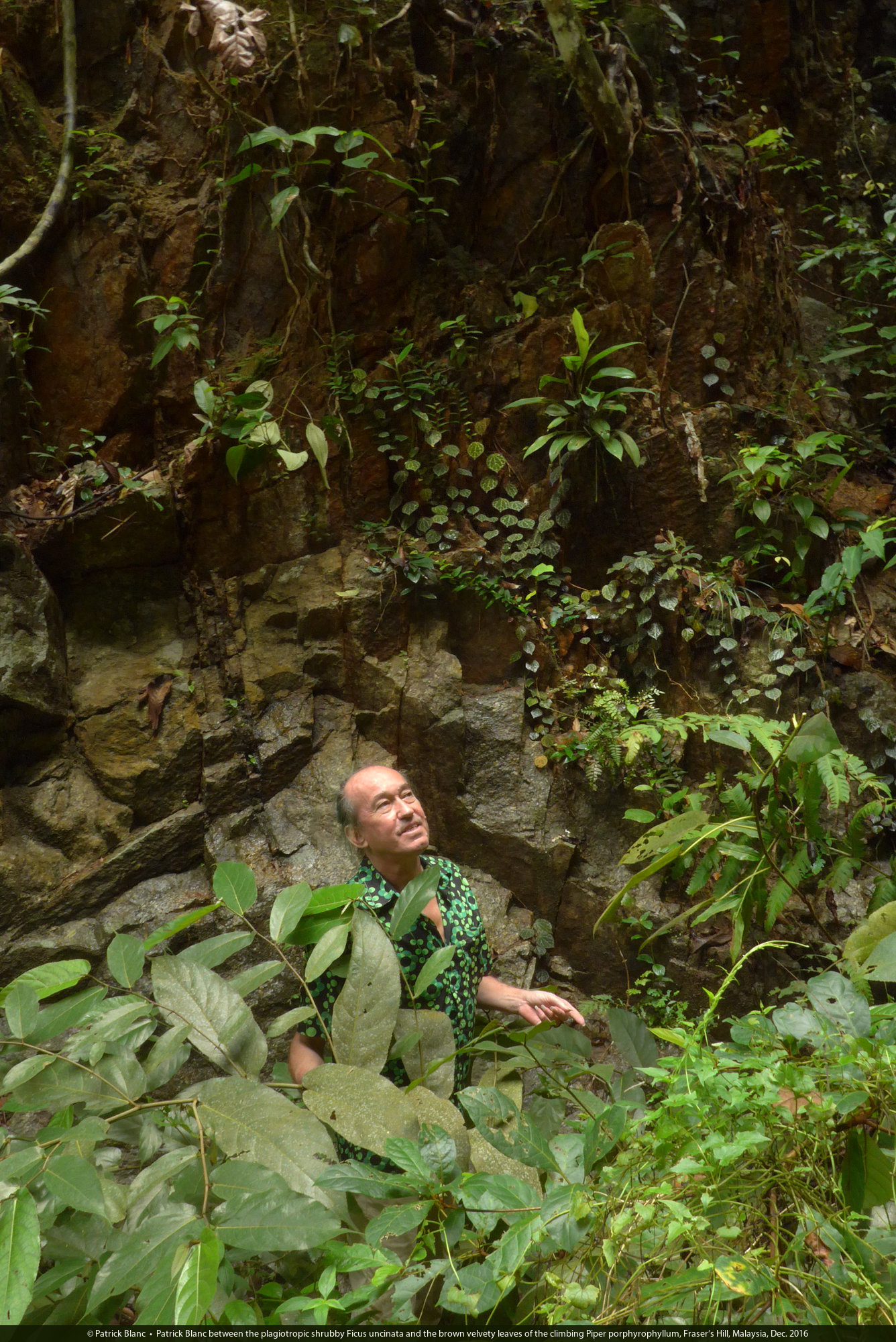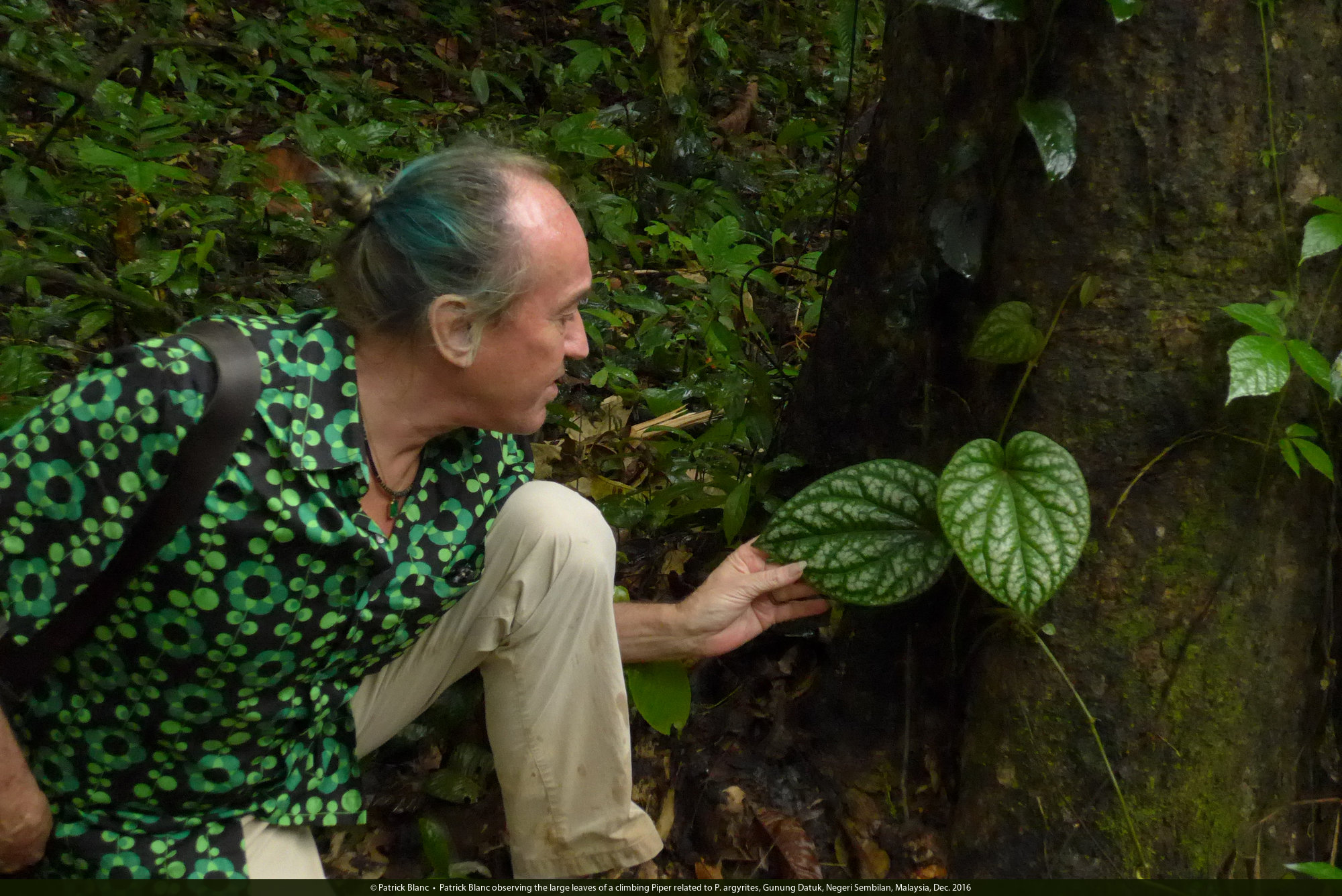 Patrick Blanc observing the large leaves of a climbing Piper related to P. argyrites, Gunung Datuk, Negeri Sembilan, Malaysia, Dec. 2016