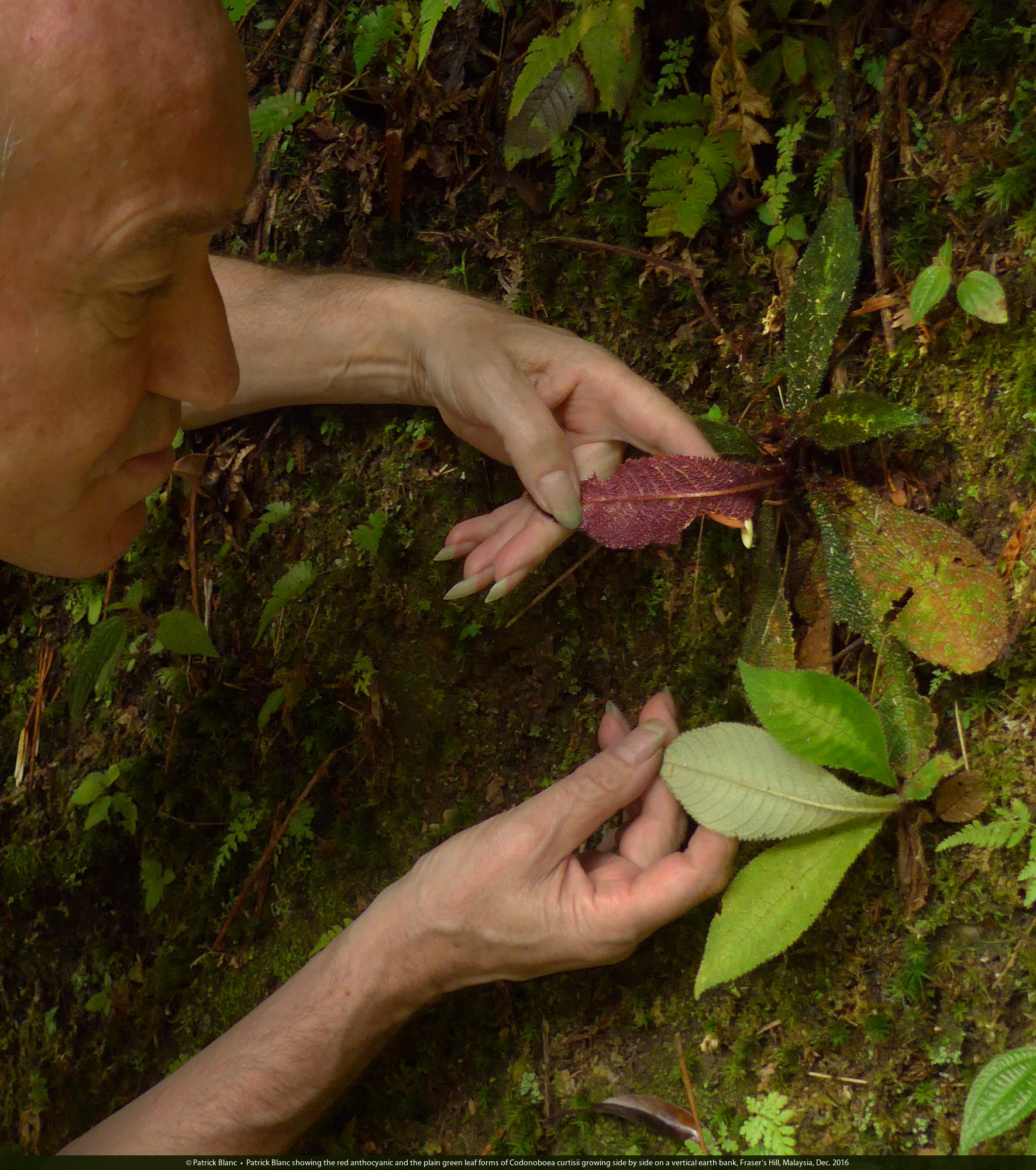 Patrick Blanc showing the red anthocyanic and the plain green leaf forms of Codonoboea curtisii growing side by side on a vertical earth bank, Fraser's Hill, Malaysia, Dec. 2016