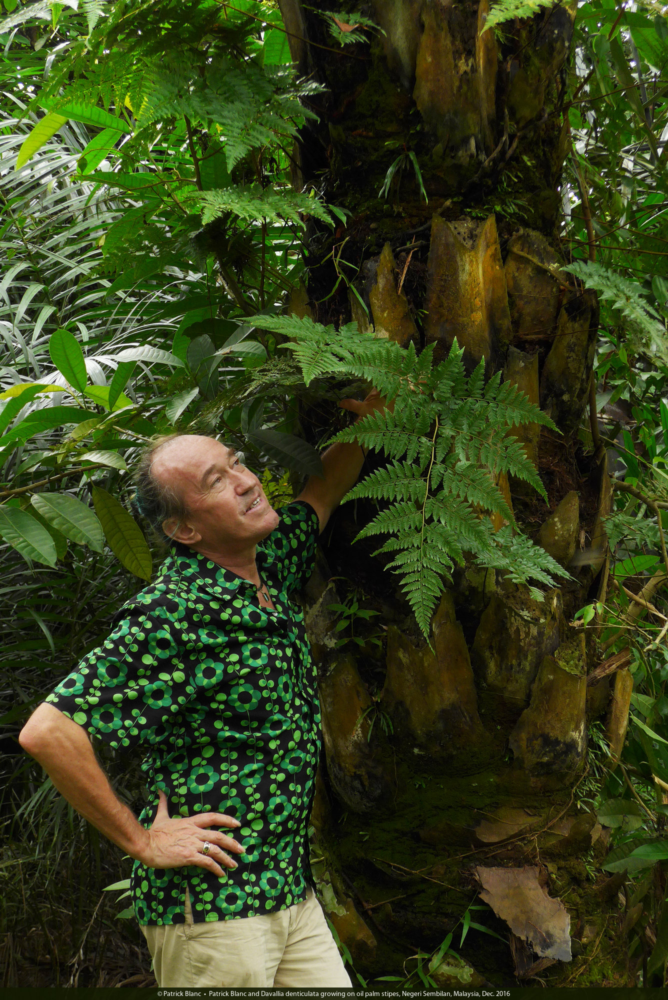 Patrick Blanc and Davallia denticulata growing on oil palm stipes, Negeri Sembilan, Malaysia, Dec. 2016