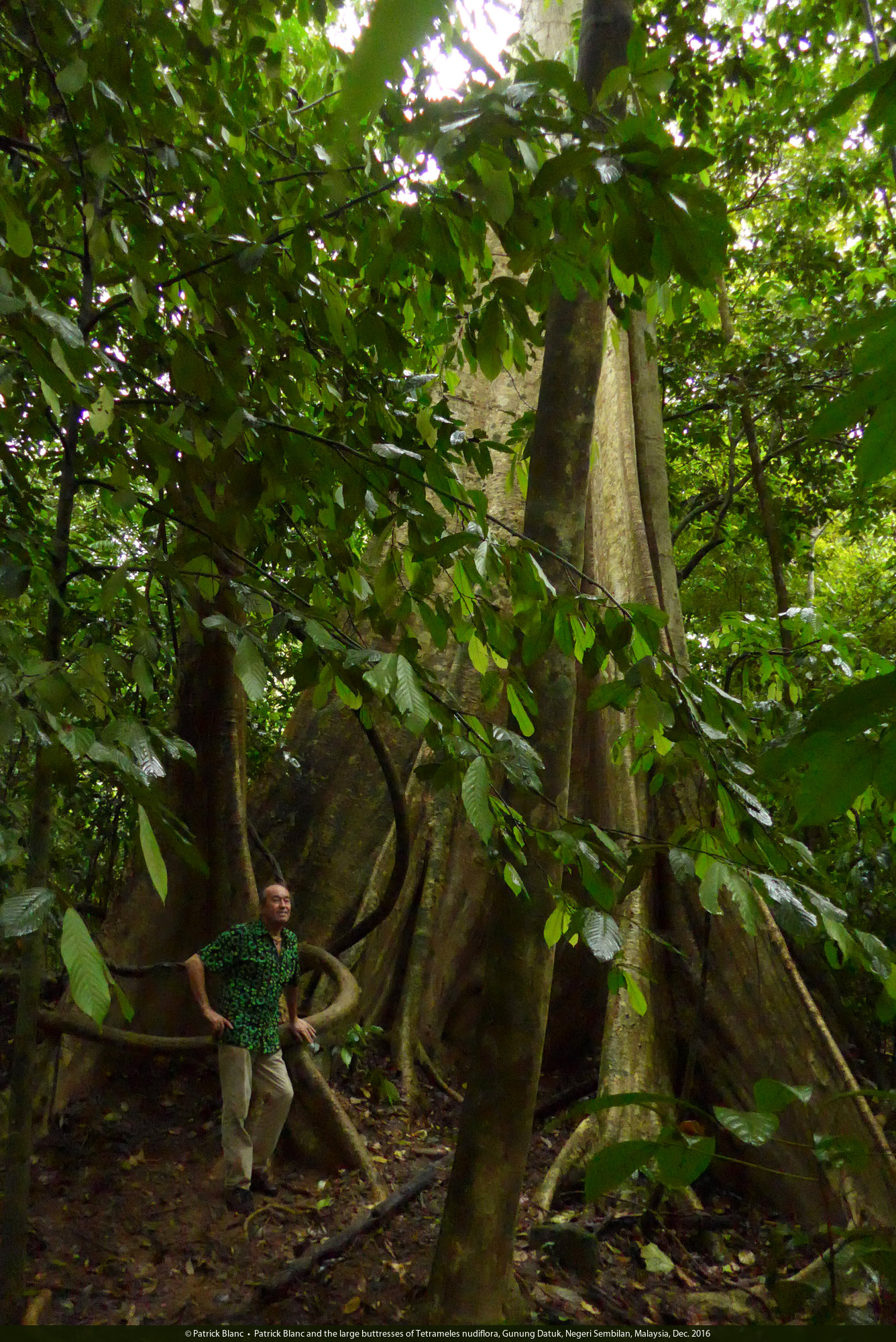 Patrick Blanc and the large buttresses of Tetrameles nudiflora, Gunung Datuk, Negeri Sembilan, Malaysia, Dec. 2016