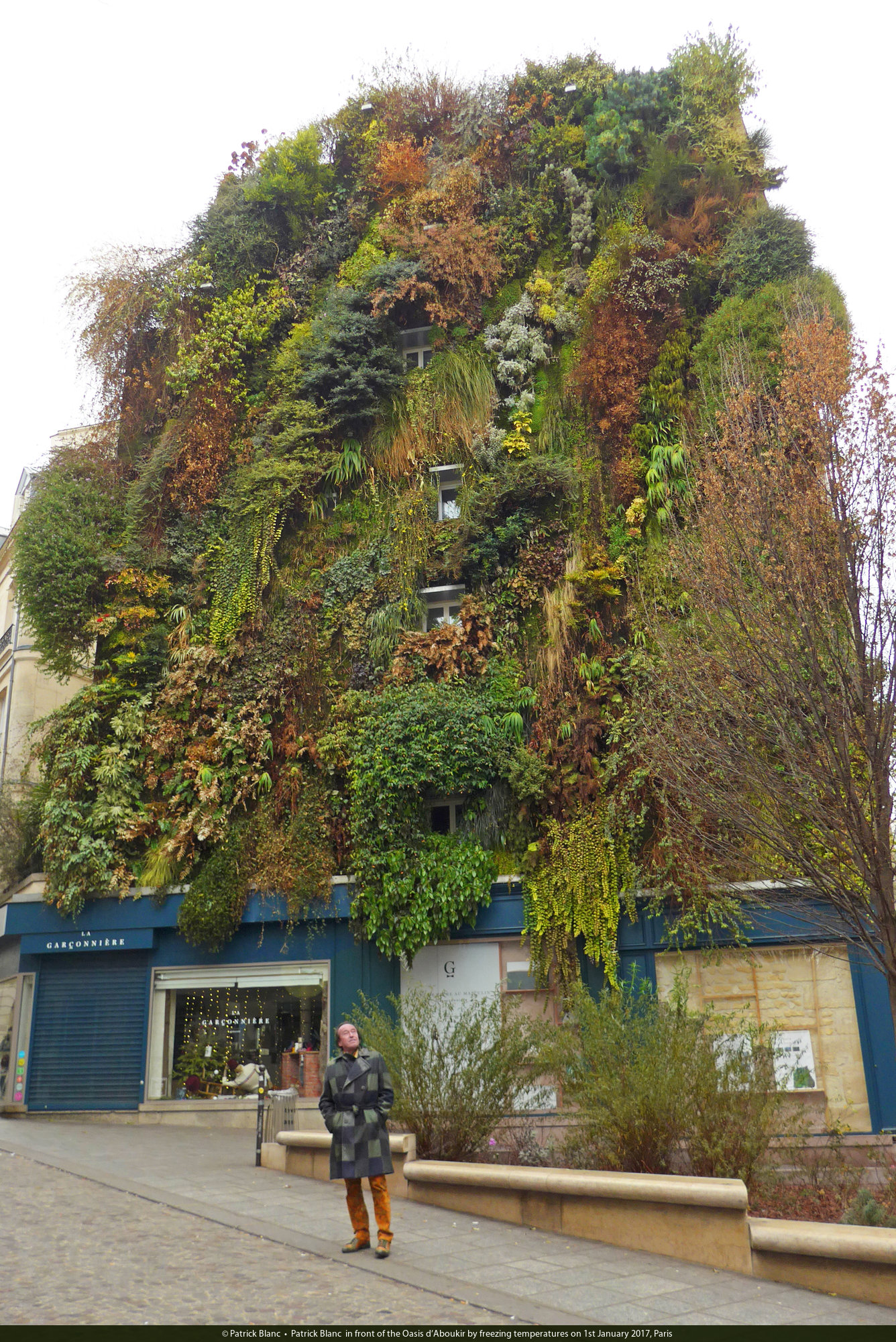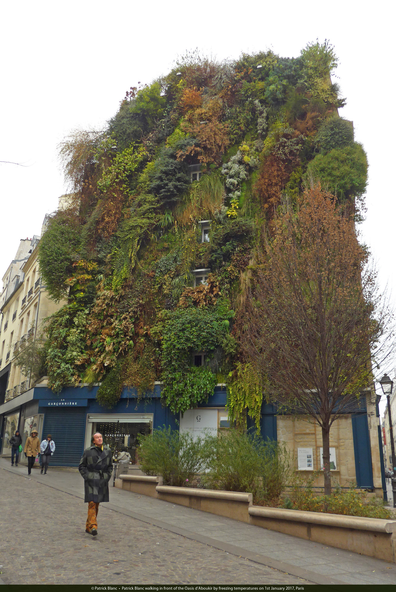 Patrick Blanc in front of the Oasis d'Aboukir by freezing temperatures on 1st January 2017, Paris