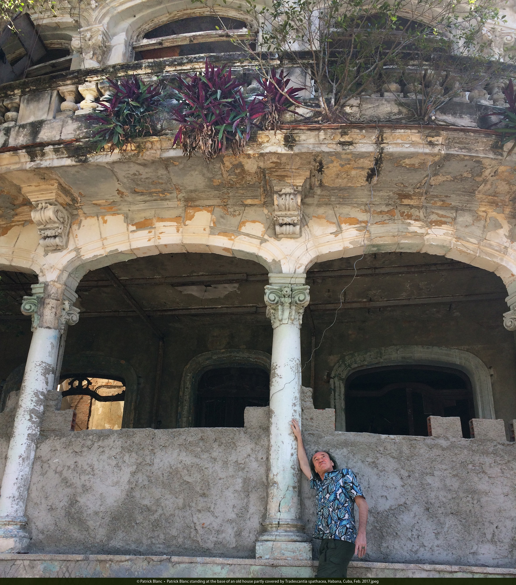 Patrick Blanc standing at the base of an old house partly covered by Tradescantia spathacea, Habana, Cuba, Feb. 2017.jpeg