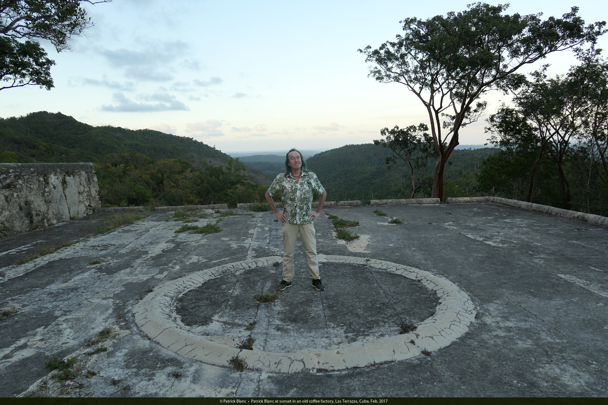 Patrick Blanc at sunset in an old coffee factory, Las Terrazas, Cuba, Feb. 2017