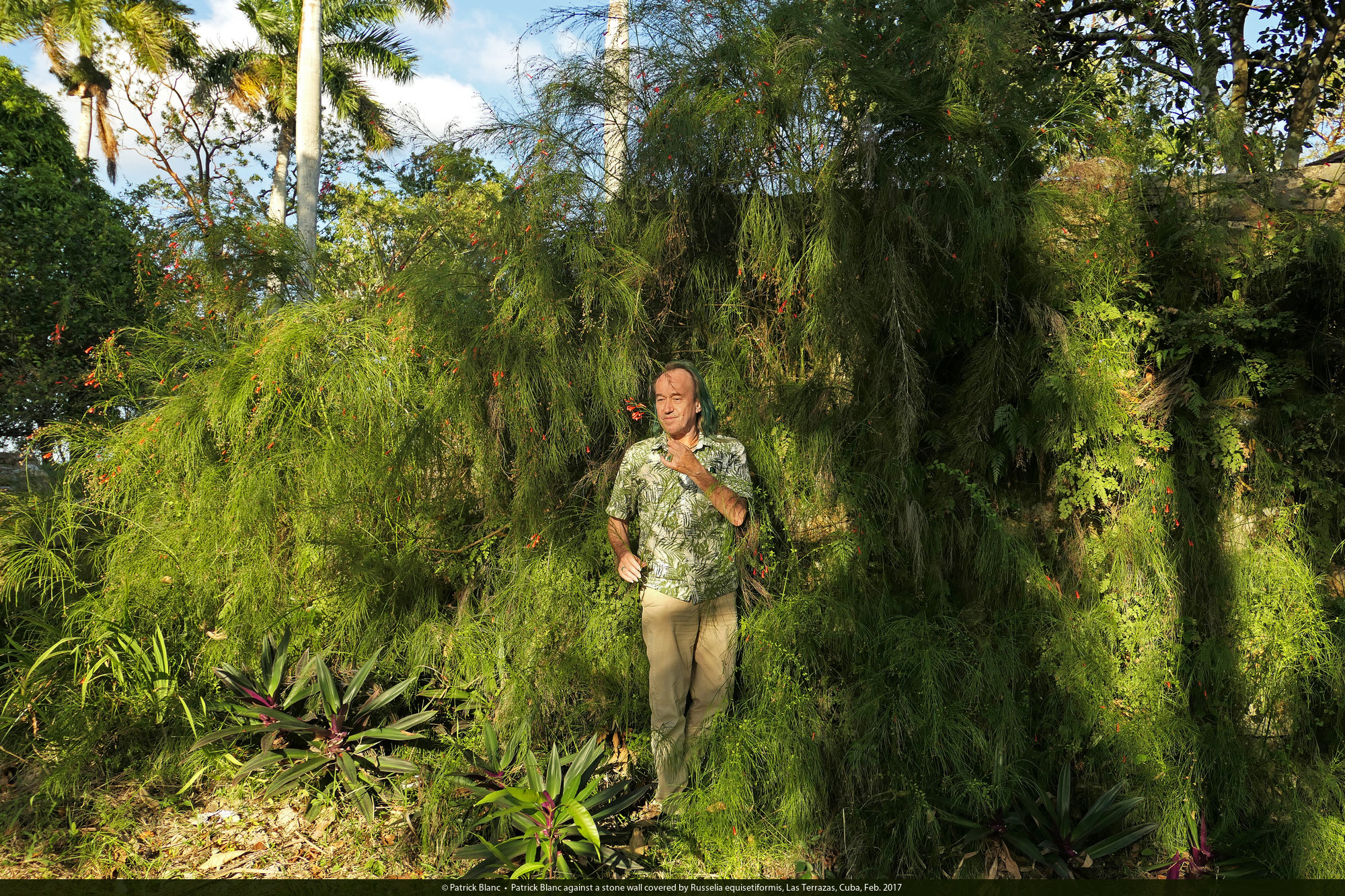 Patrick Blanc against a stone wall covered by Russelia equisetiformis, Las Terrazas, Cuba, Feb. 2017