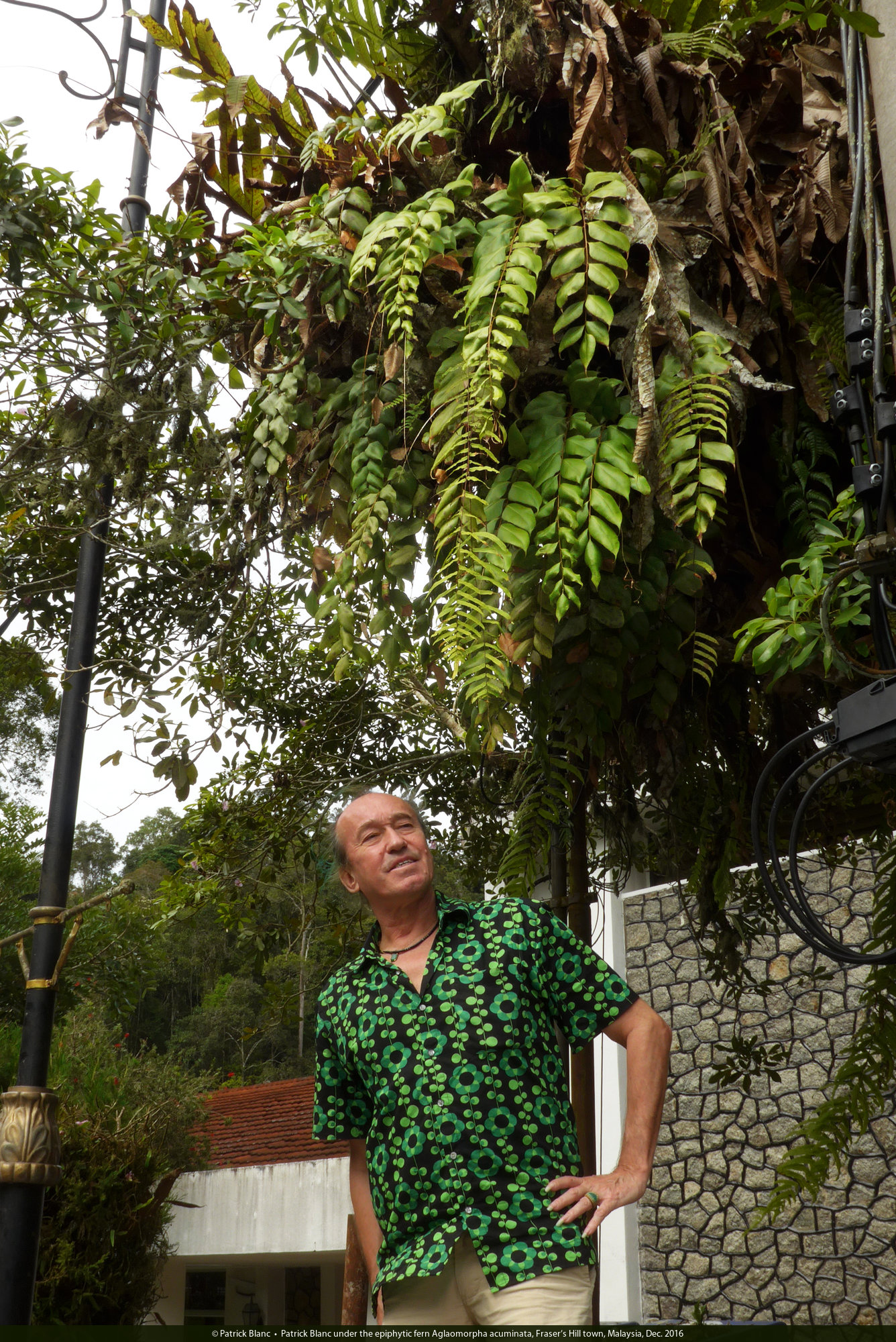 Patrick Blanc under the epiphytic fern Aglaomorpha acuminata, Fraser's Hill town, Malaysia, Dec. 2016