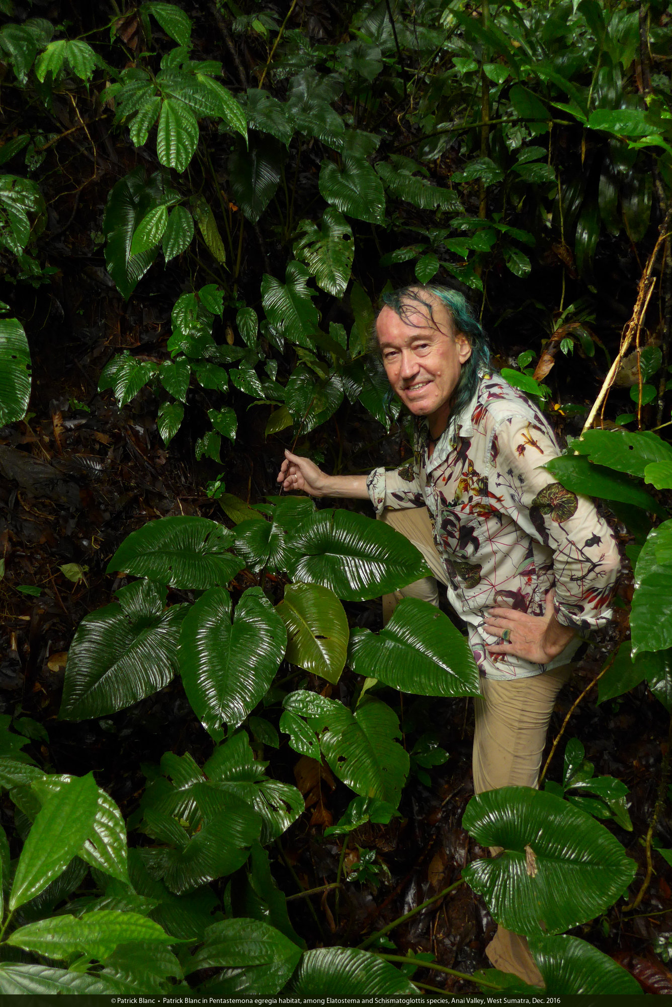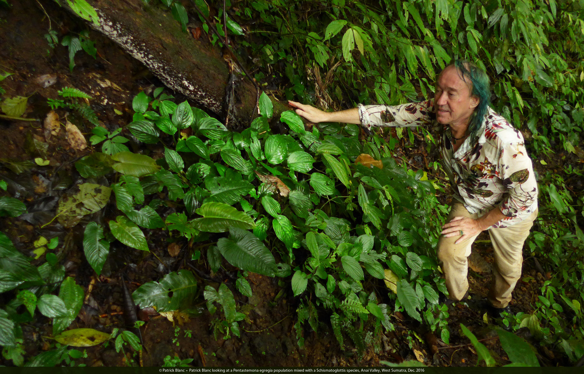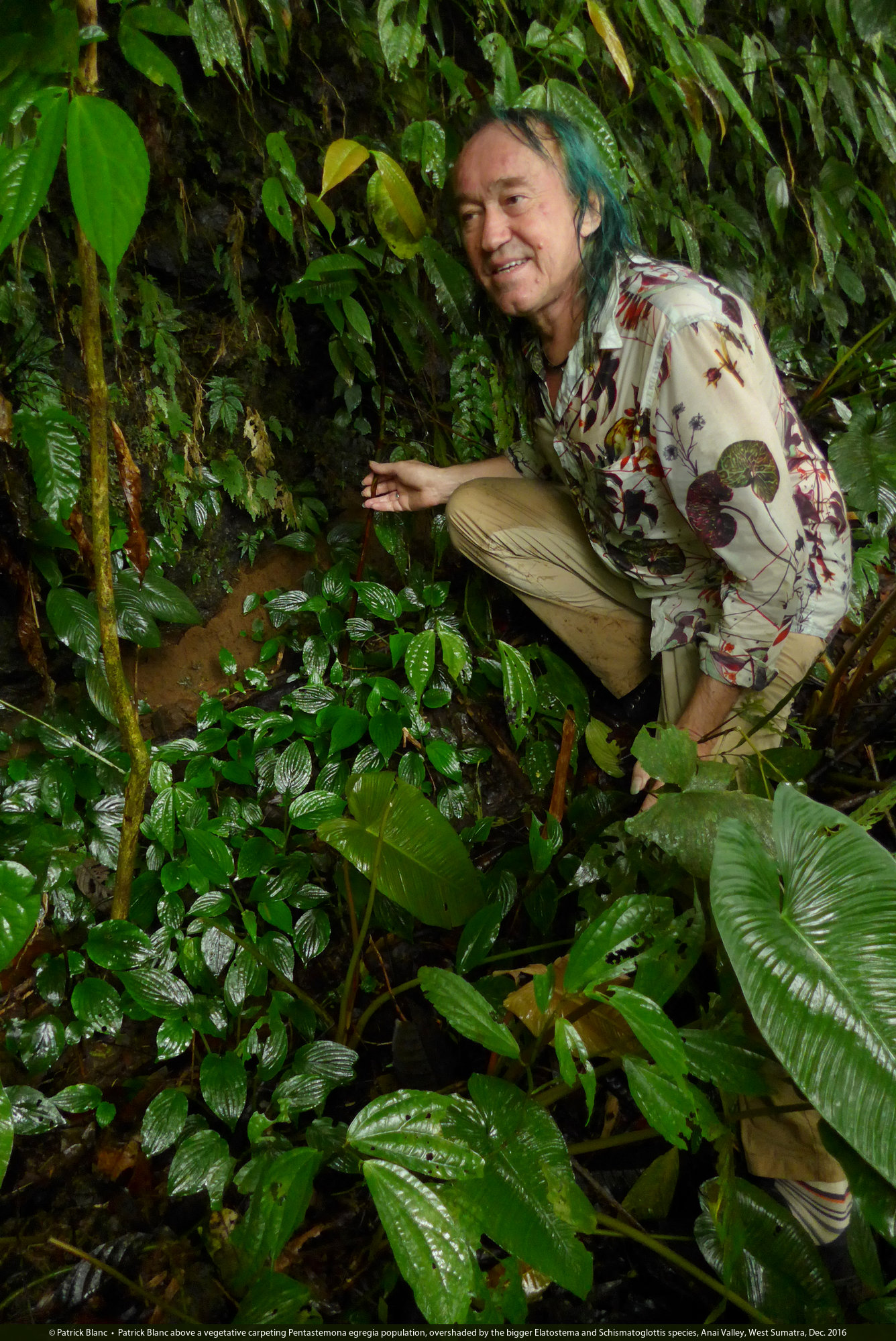 Patrick Blanc in Pentastemona egregia habitat, among Elatostema and Schismatoglottis species, Anai Valley, West Sumatra, Dec. 2016