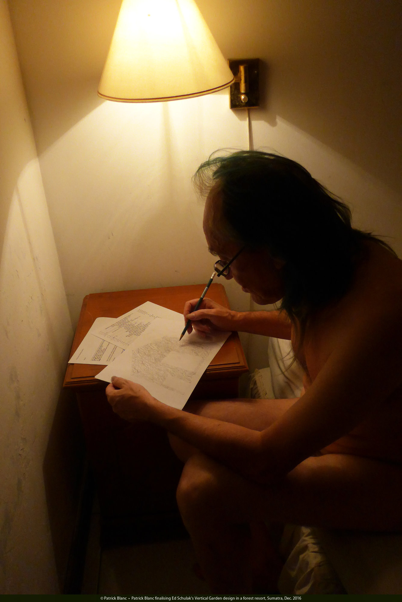 Patrick Blanc finalising Ed Schulak's Vertical Garden design in a forest resort, Sumatra, Dec. 2016