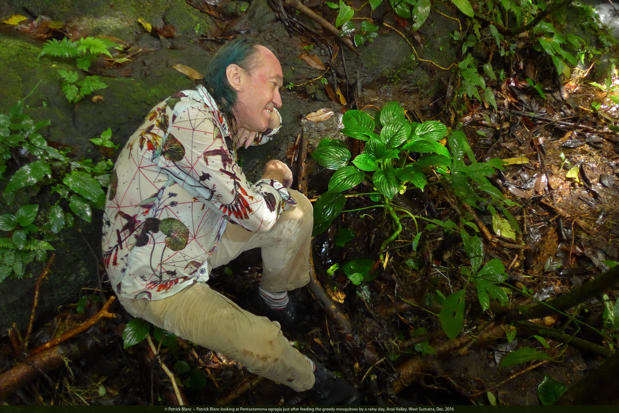 Patrick Blanc looking at Pentastemona egregia just after feeding the greedy mosquitoes by a rainy day, Anai Valley, West Sumatra, Dec. 2016