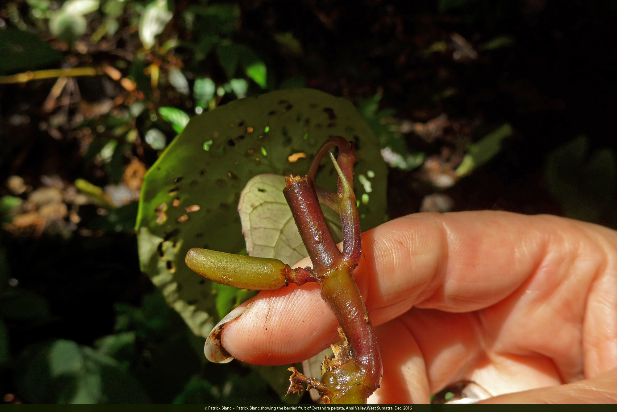Patrick Blanc showing the berried fruit of Cyrtandra peltata, Anai Valley,West Sumatra, Dec. 2016