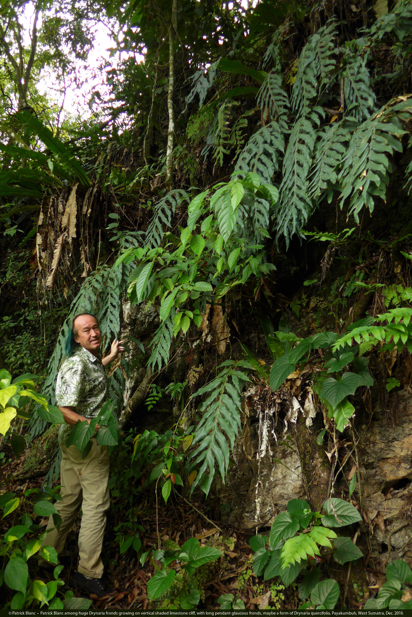 Patrick Blanc under huge Drynaria ferns growing on vertical shaded limestone cliff, with long pendant glaucous fronds, maybe a form of Drynaria quercifolia, Payakumbuh, West Sumatra, Dec. 2016