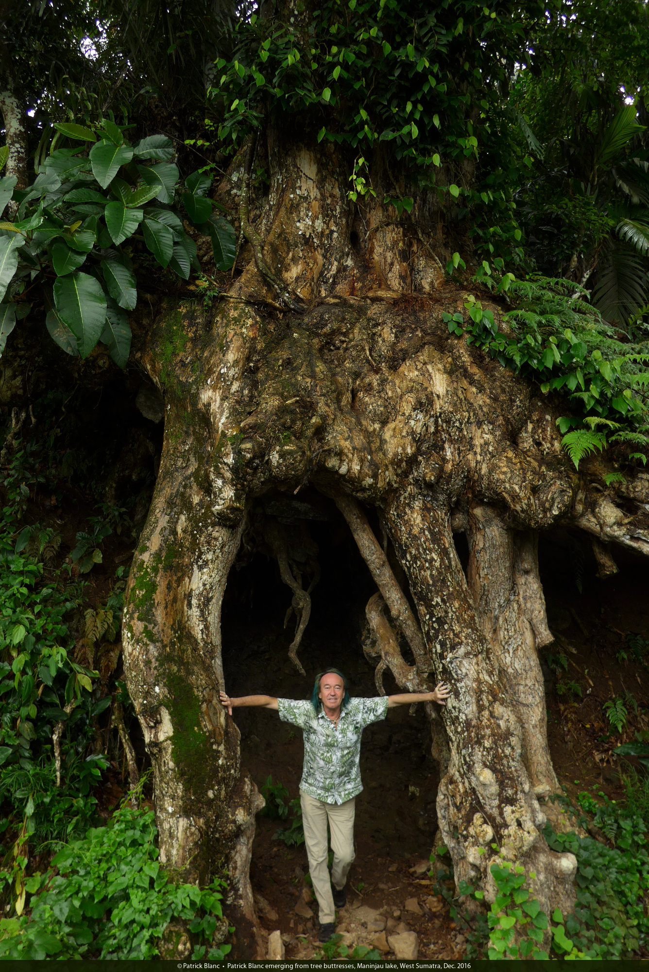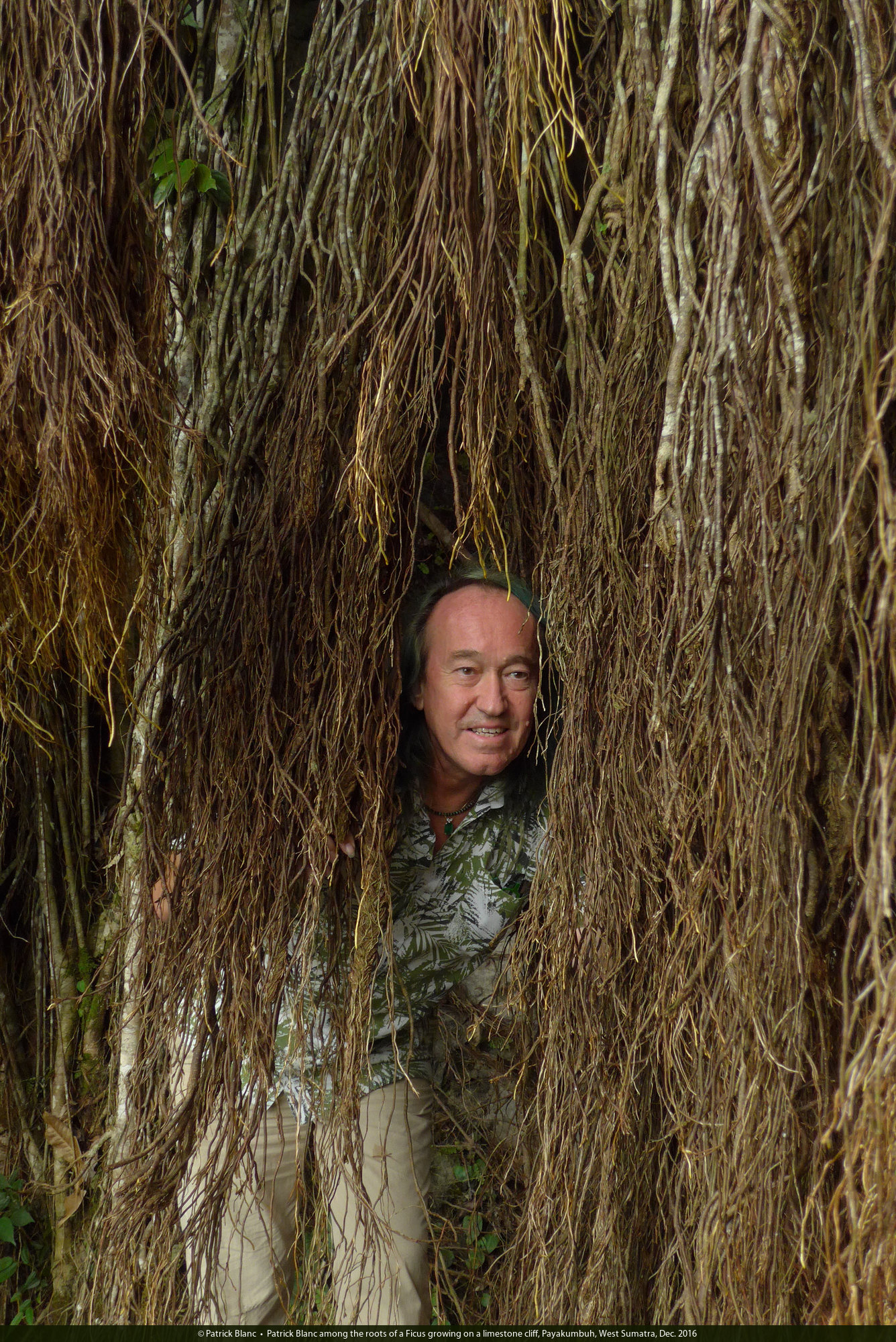 Patrick Blanc emerging from tree buttresses, Maninjau lake, West Sumatra, Dec. 2016