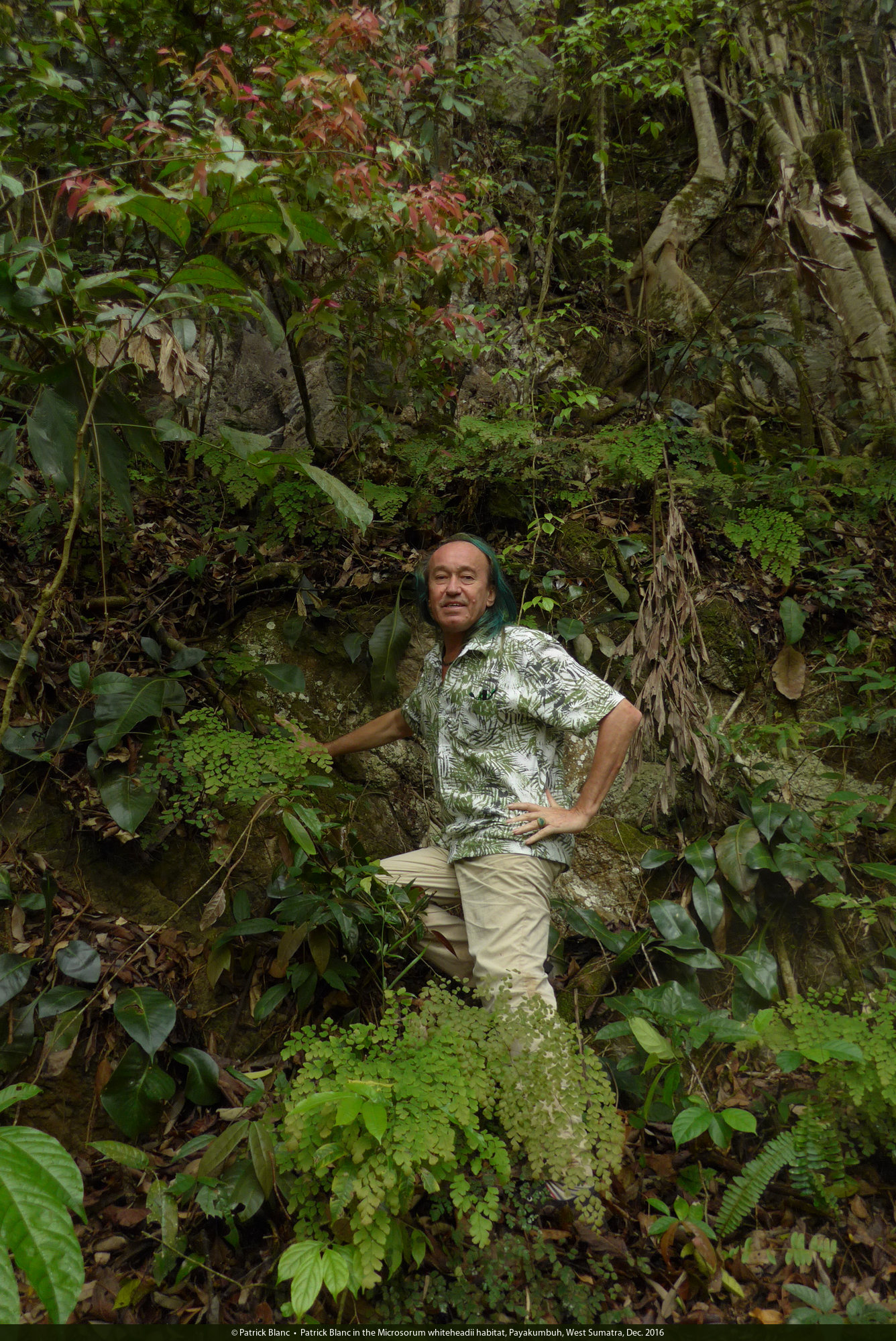 Patrick Blanc in the Microsorum whiteheadii habitat, Payakumbuh, West Sumatra, Dec. 2016