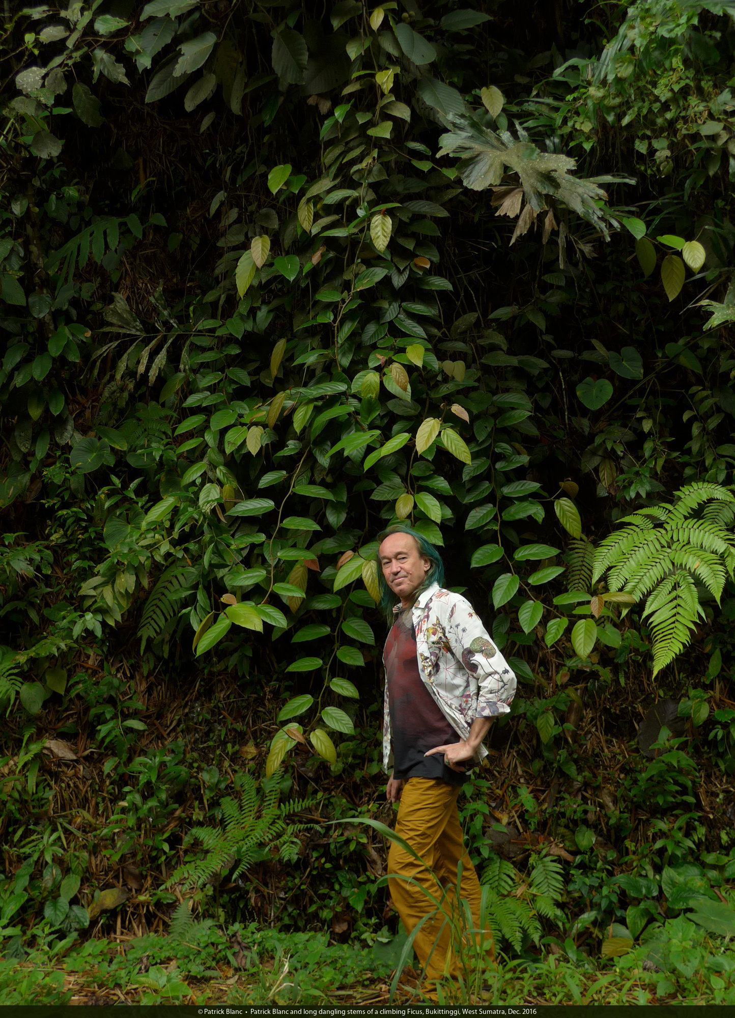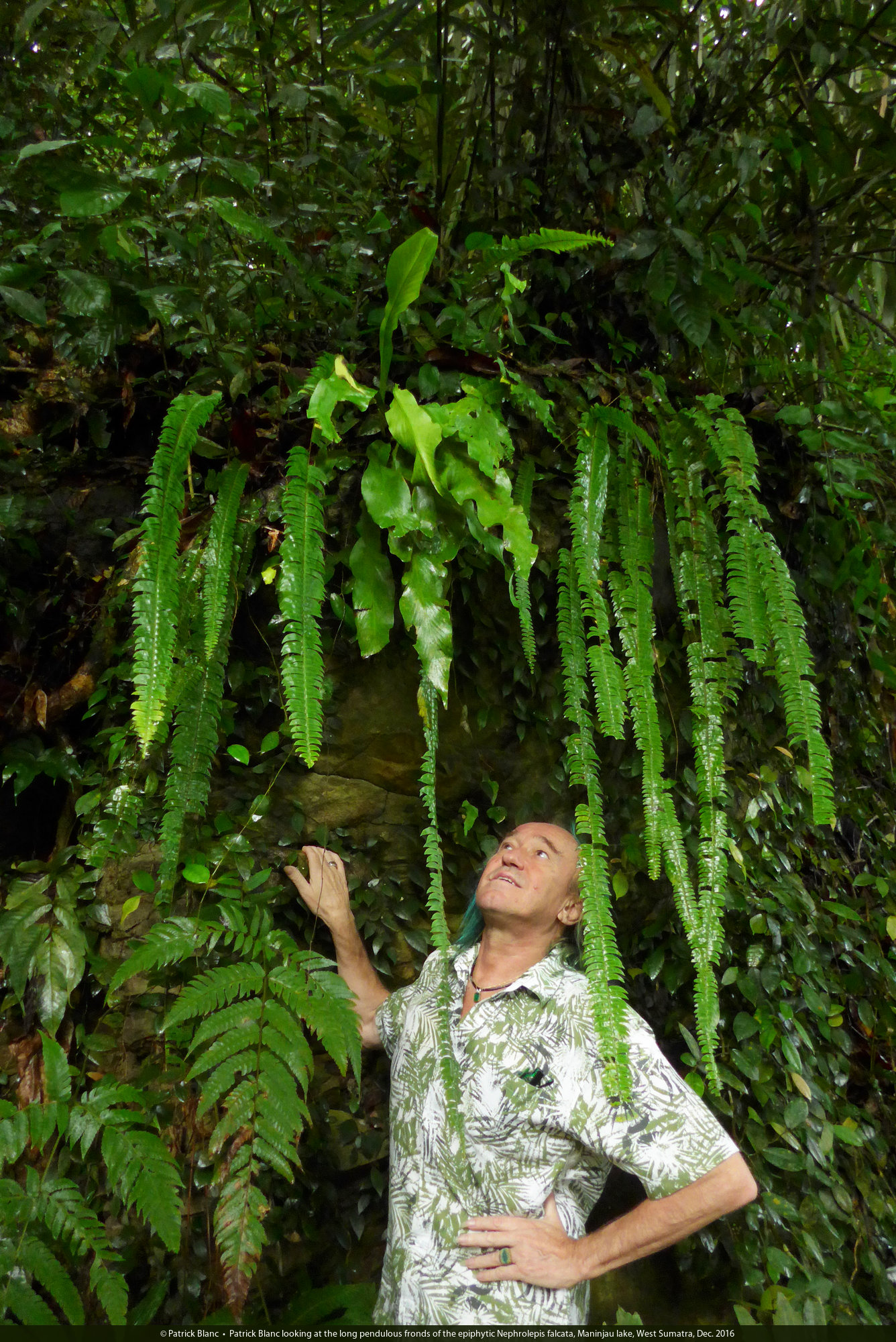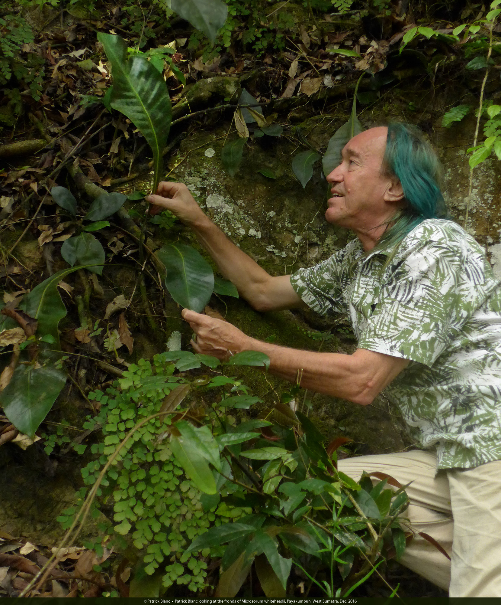 Patrick Blanc looking at the fronds of Microsorum whiteheadii, Payakumbuh, West Sumatra, Dec. 2016