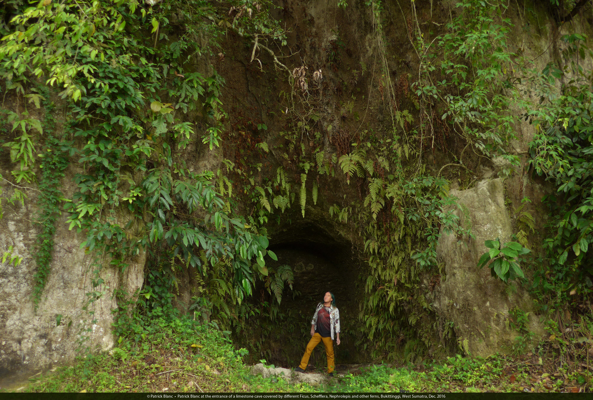 Patrick Blanc at the entrance of a limestone cave covered by different Ficus, Schefflera, Nephrolepis and other ferns, Bukittinggi, West Sumatra, Dec. 2016