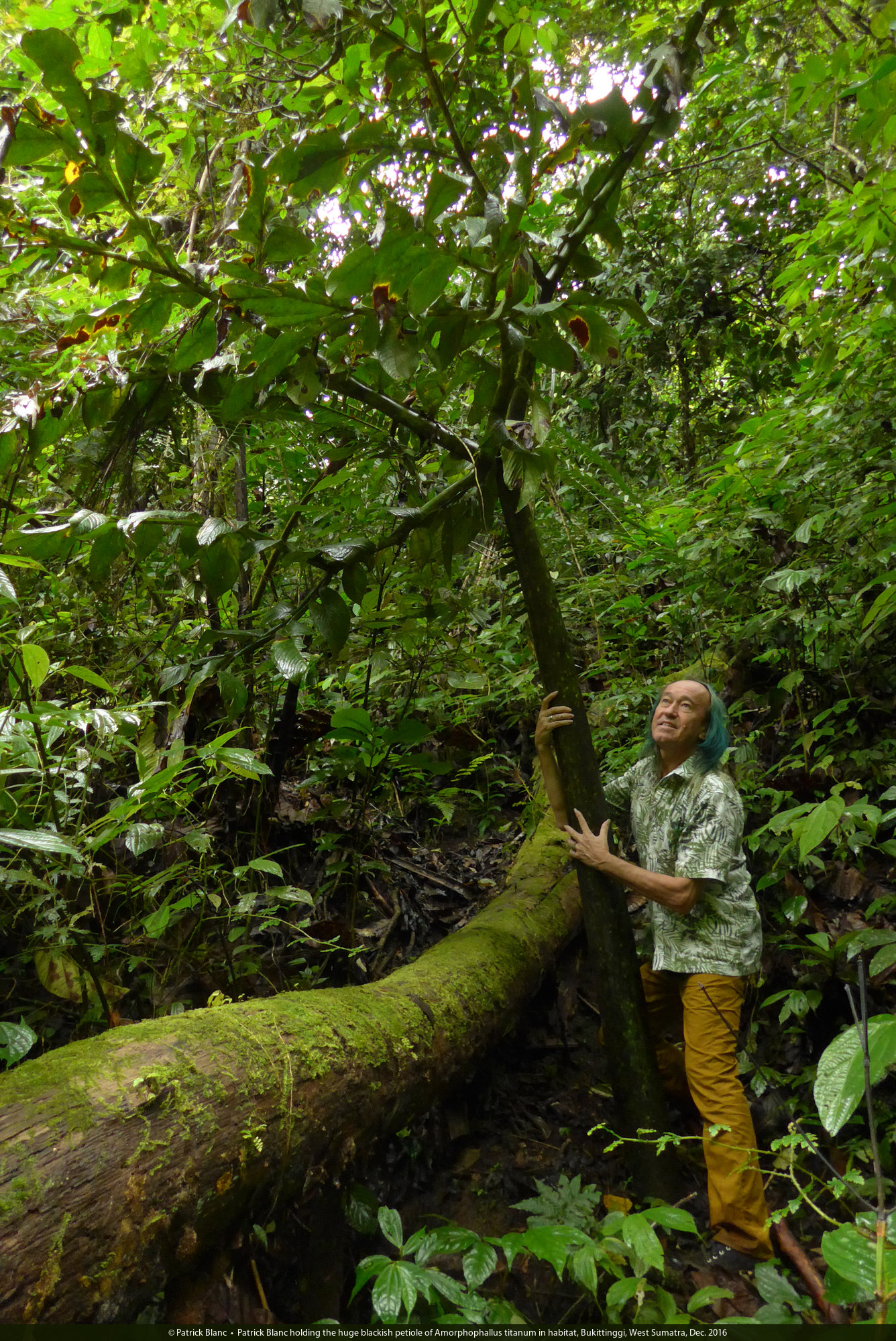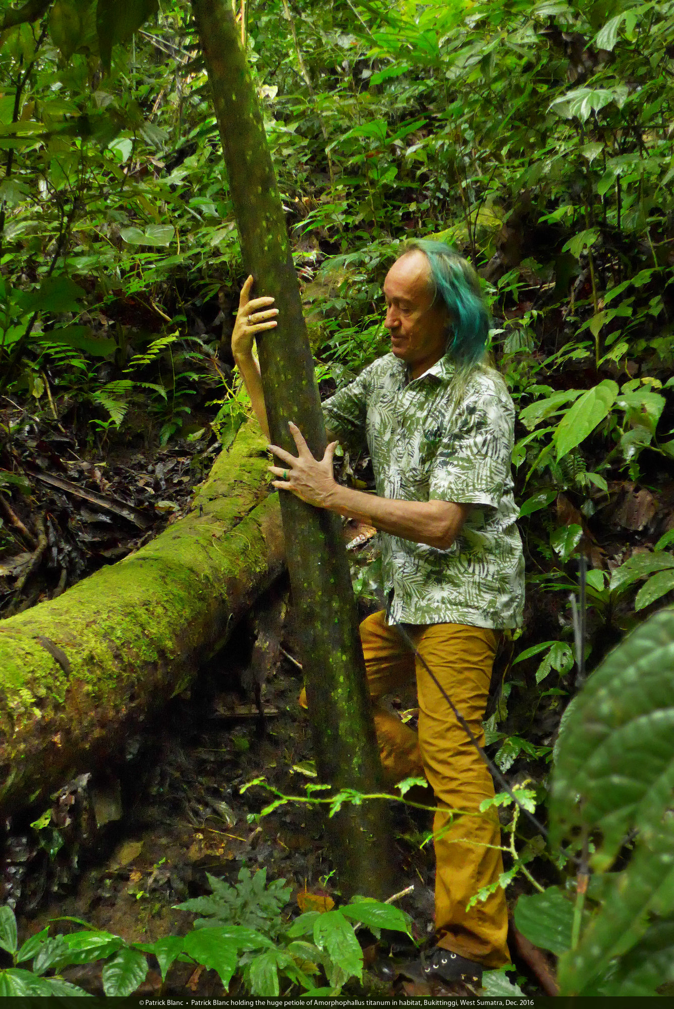 Patrick Blanc holding the huge petiole of Amorphophallus titanum in habitat, Bukittinggi, West Sumatra, Dec. 2016