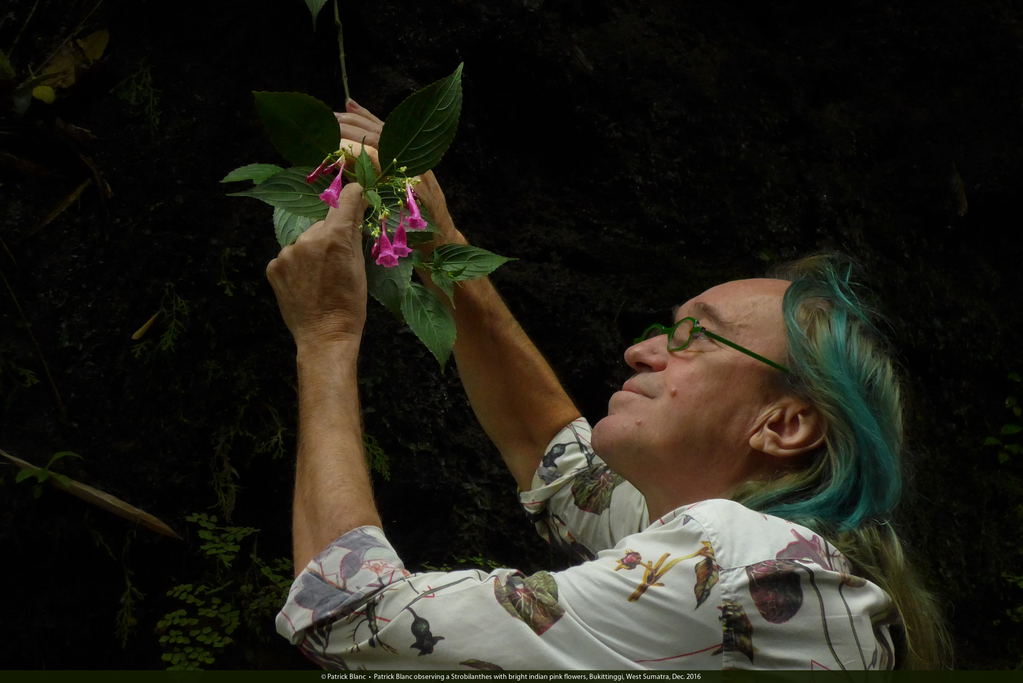 Patrick Blanc observing a Strobilanthes with bright indian pink flowers, Bukittinggi, West Sumatra, Dec. 2016