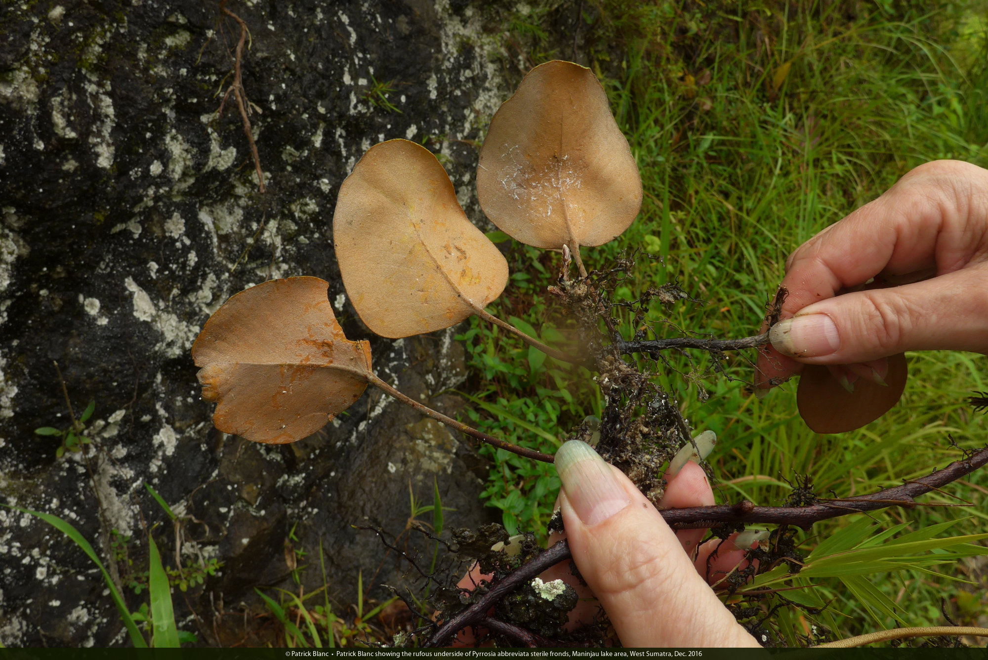 Patrick Blanc showing the rufous underside of Pyrrosia abbreviata sterile fronds, Maninjau lake area, West Sumatra, Dec. 2016