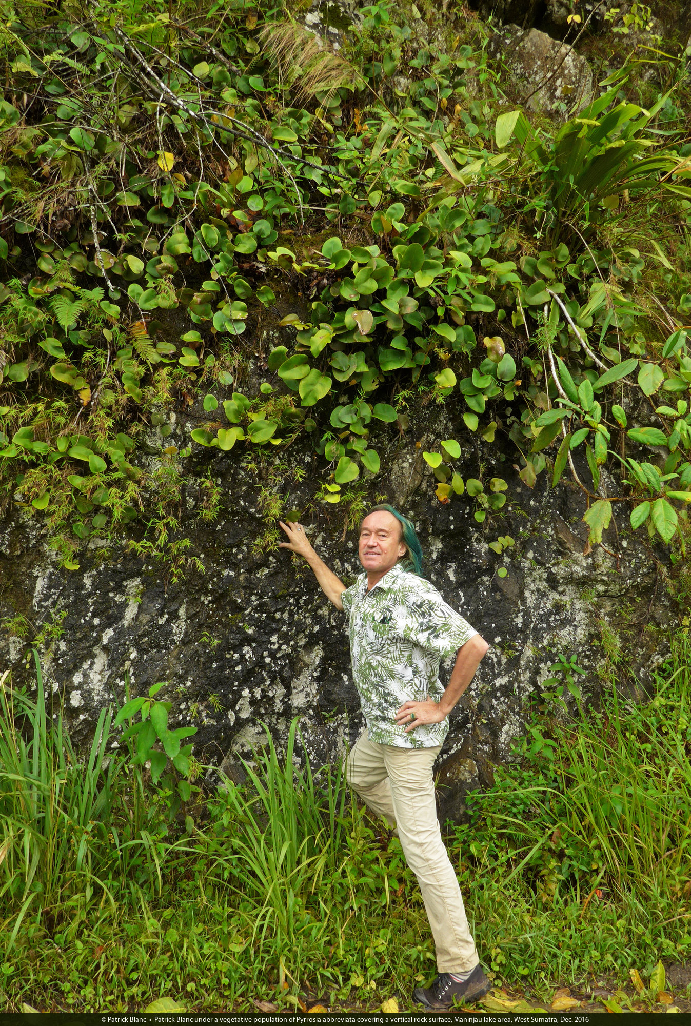 Patrick Blanc under a vegetative population of Pyrrosia abbreviata covering a vertical rock surface, Maninjau lake area, West Sumatra, Dec. 2016