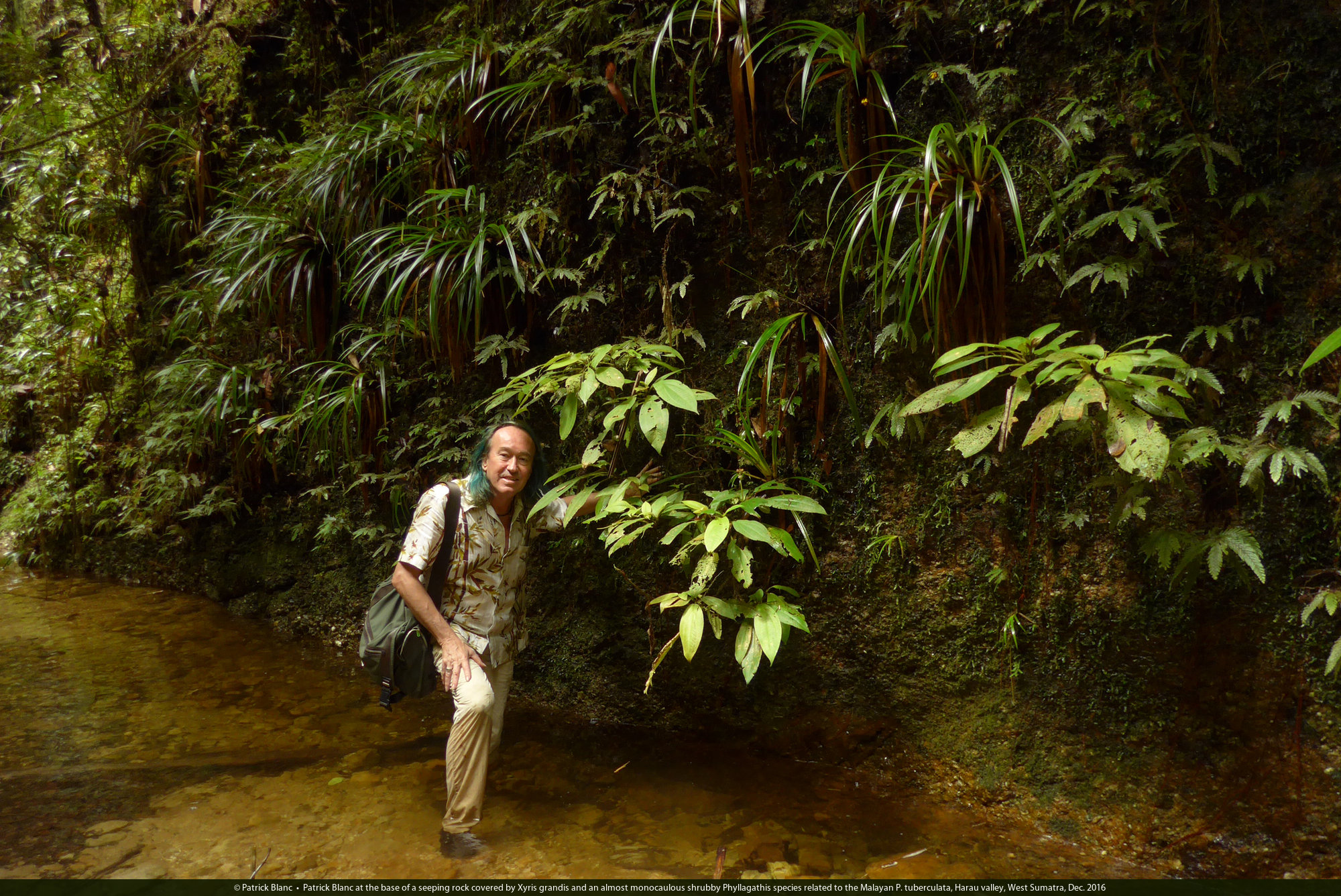 Patrick Blanc at the base of a seeping rock covered by Xyris grandis and an almost monocaulous shrubby Phyllagathis species related to the Malayan P. tuberculata, Harau valley, West Sumatra, Dec. 2016