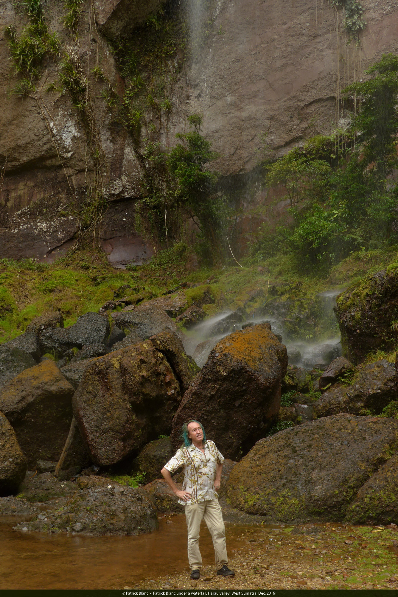 Patrick Blanc under a waterfall, Harau valley, West Sumatra, Dec. 2016