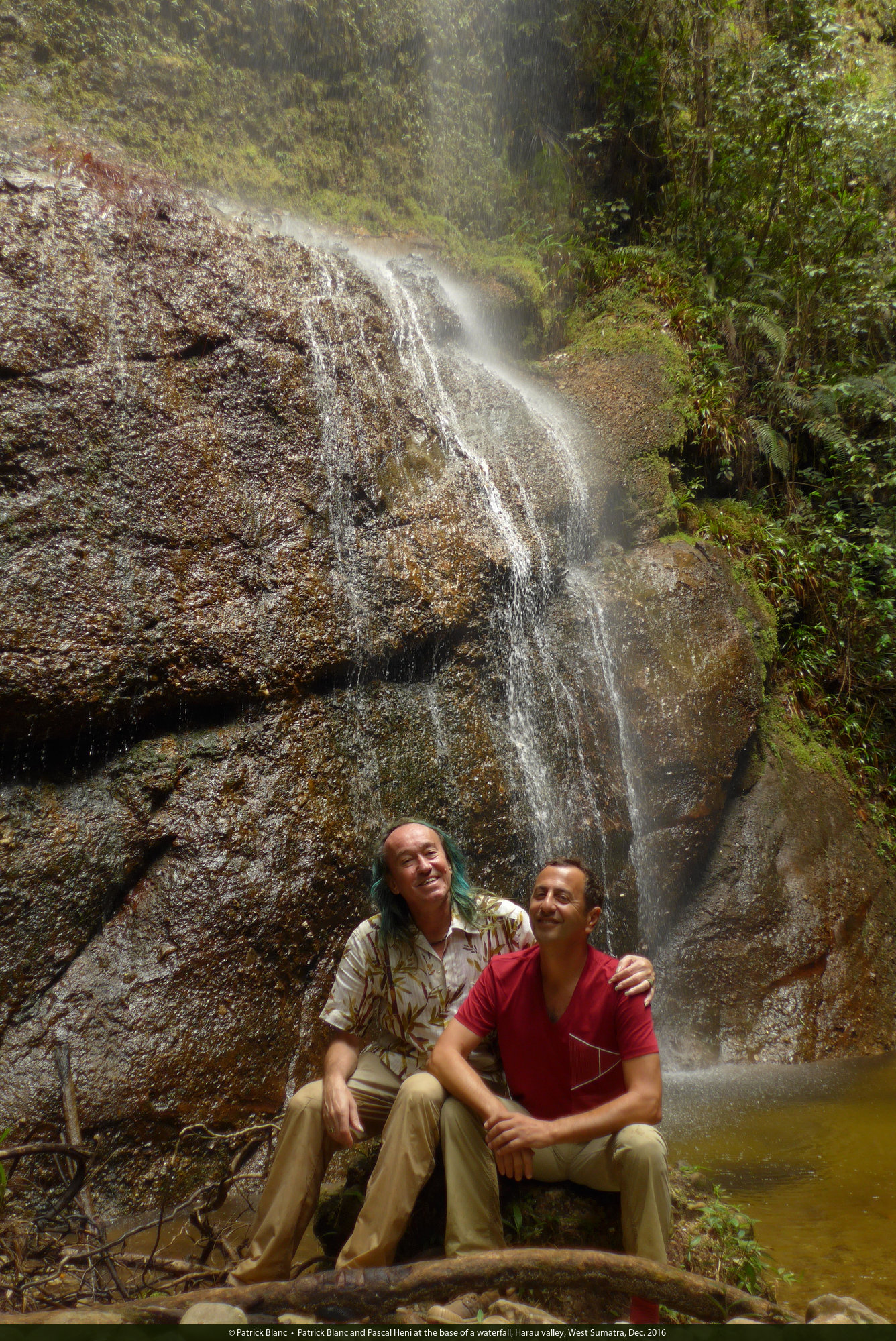 Patrick Blanc and Pascal Heni at the base of a waterfall, Harau valley, West Sumatra, Dec. 2016