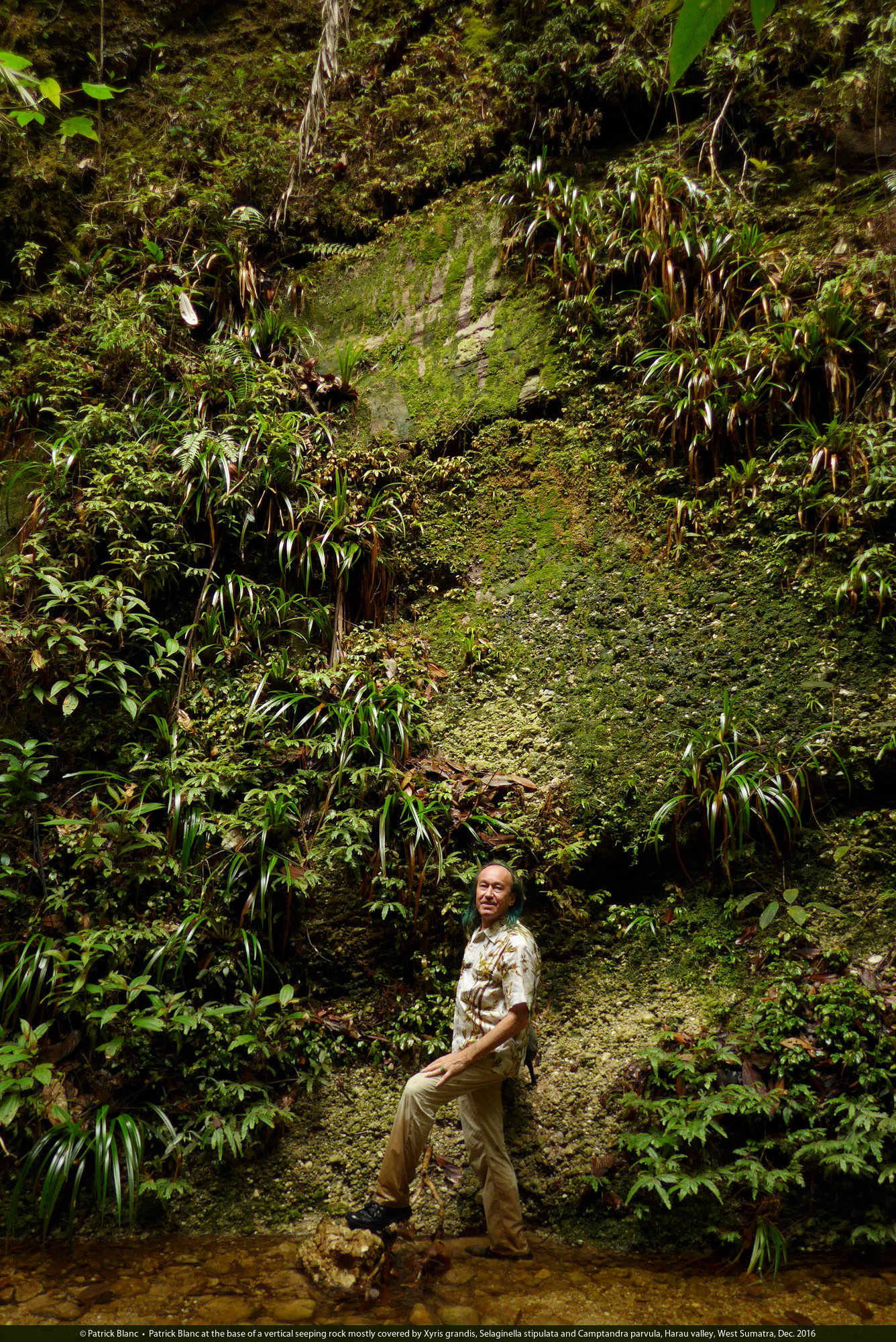Patrick Blanc at the base of a vertical seeping rock mostly covered by Xyris grandis, Selaginella stipulata and Camptandra parvula, Harau valley, West Sumatra, Dec. 2016