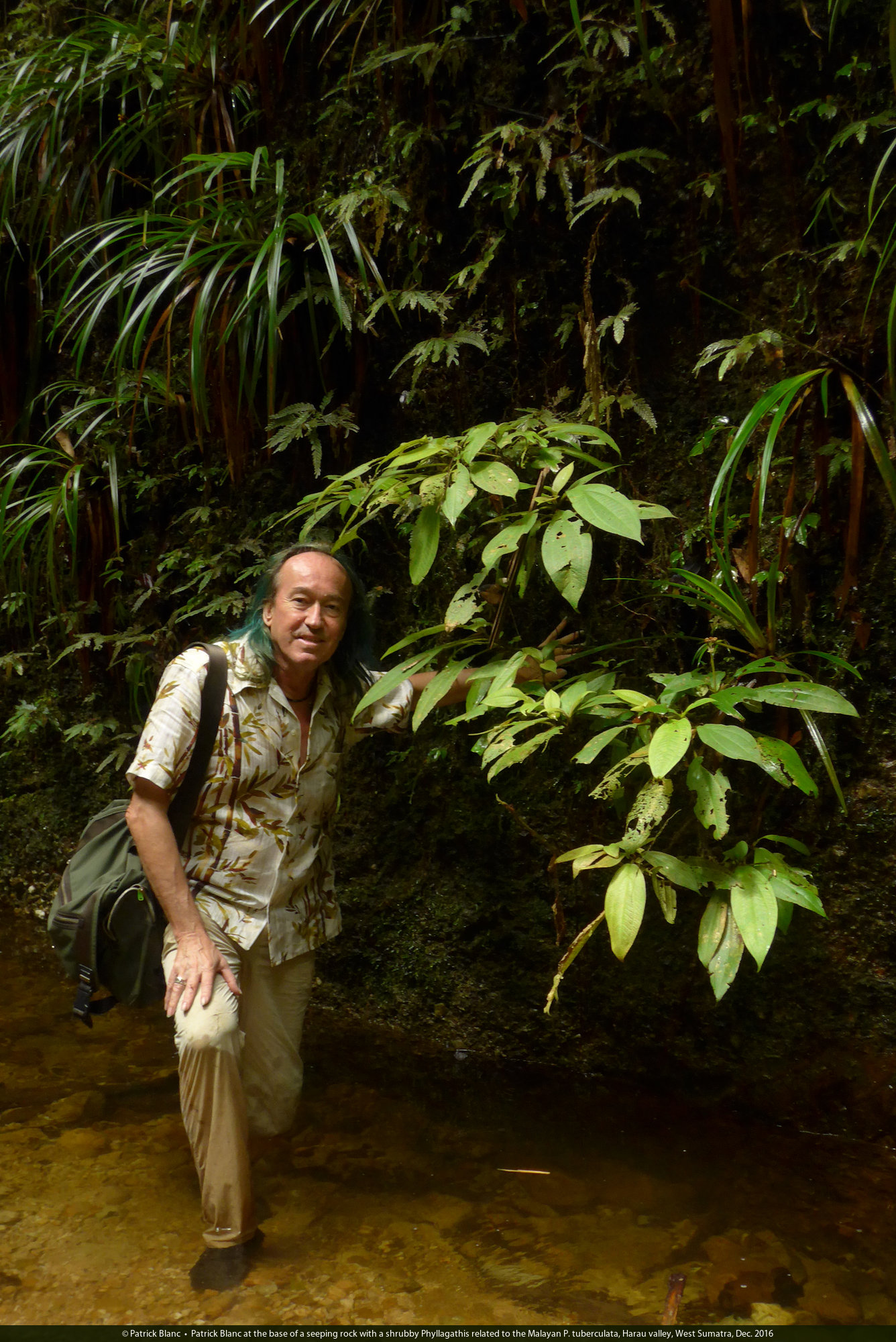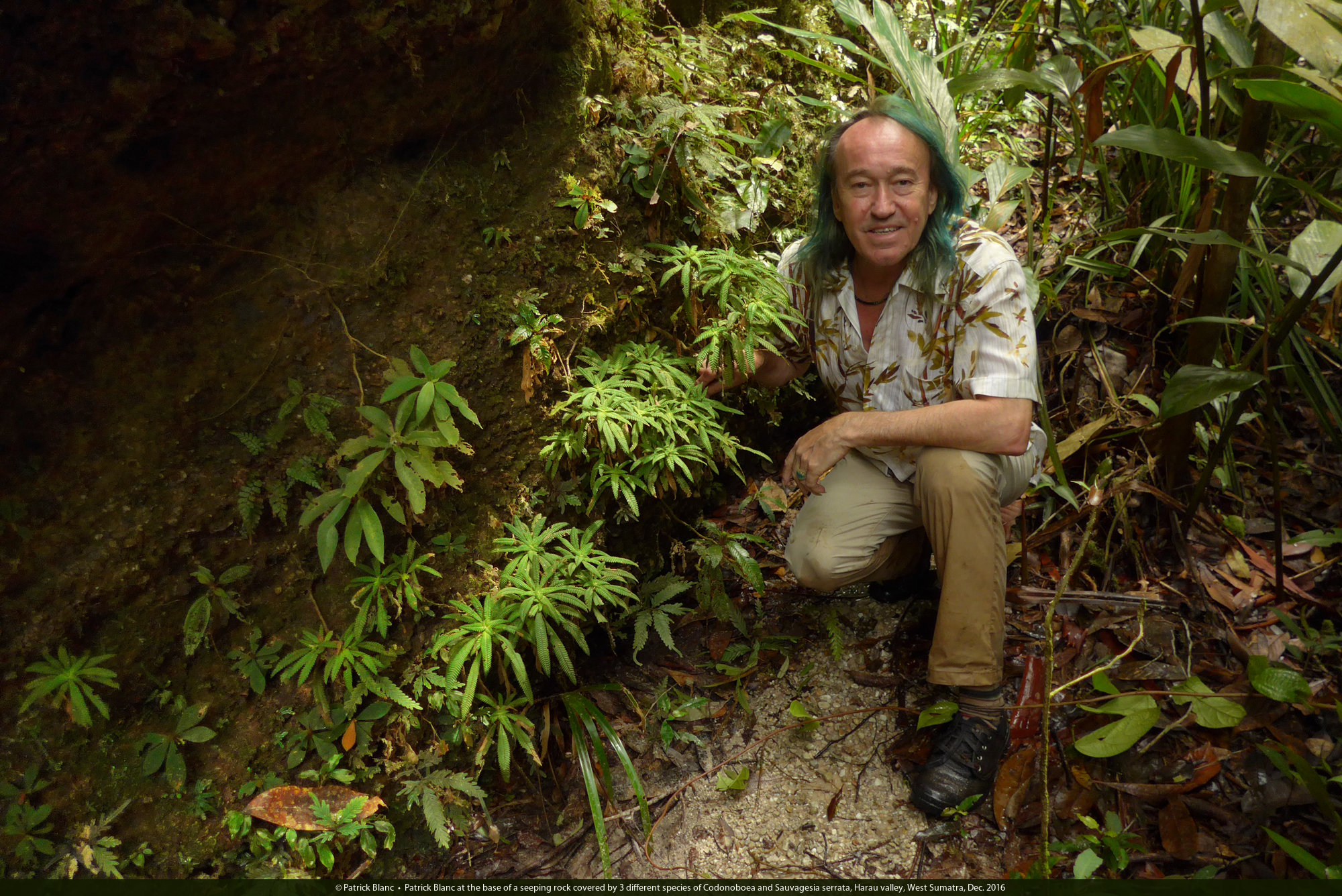 Patrick Blanc at the base of a seeping rock covered by 3 different species of Codonoboea and Sauvagesia serrata, Harau valley, West Sumatra, Dec. 2016