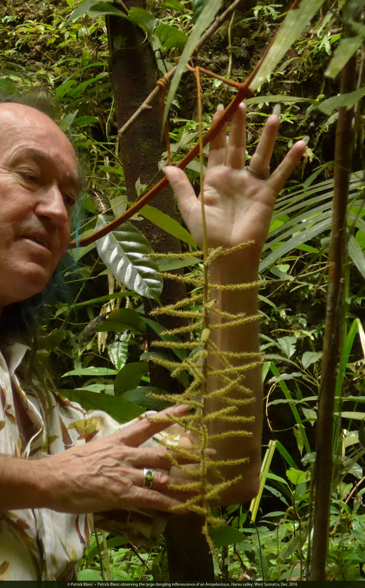 Patrick Blanc observing the large dangling inflorescence of an Ampelocissus, Harau valley, West Sumatra, Dec. 2016