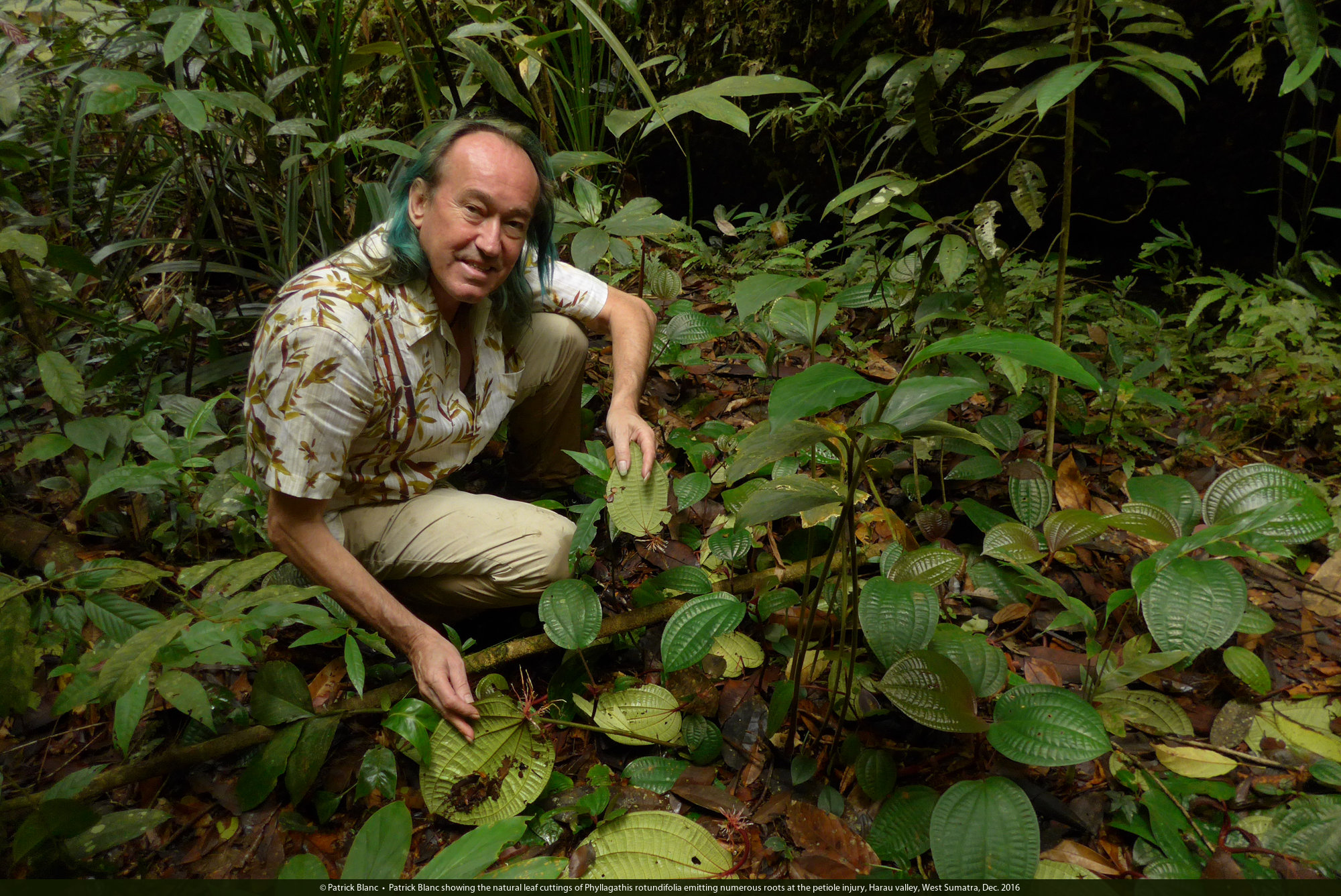 Patrick Blanc showing the natural leaf cuttings of Phyllagathis rotundifolia emitting numerous roots at the petiole injury, Harau valley, West Sumatra, Dec. 2016