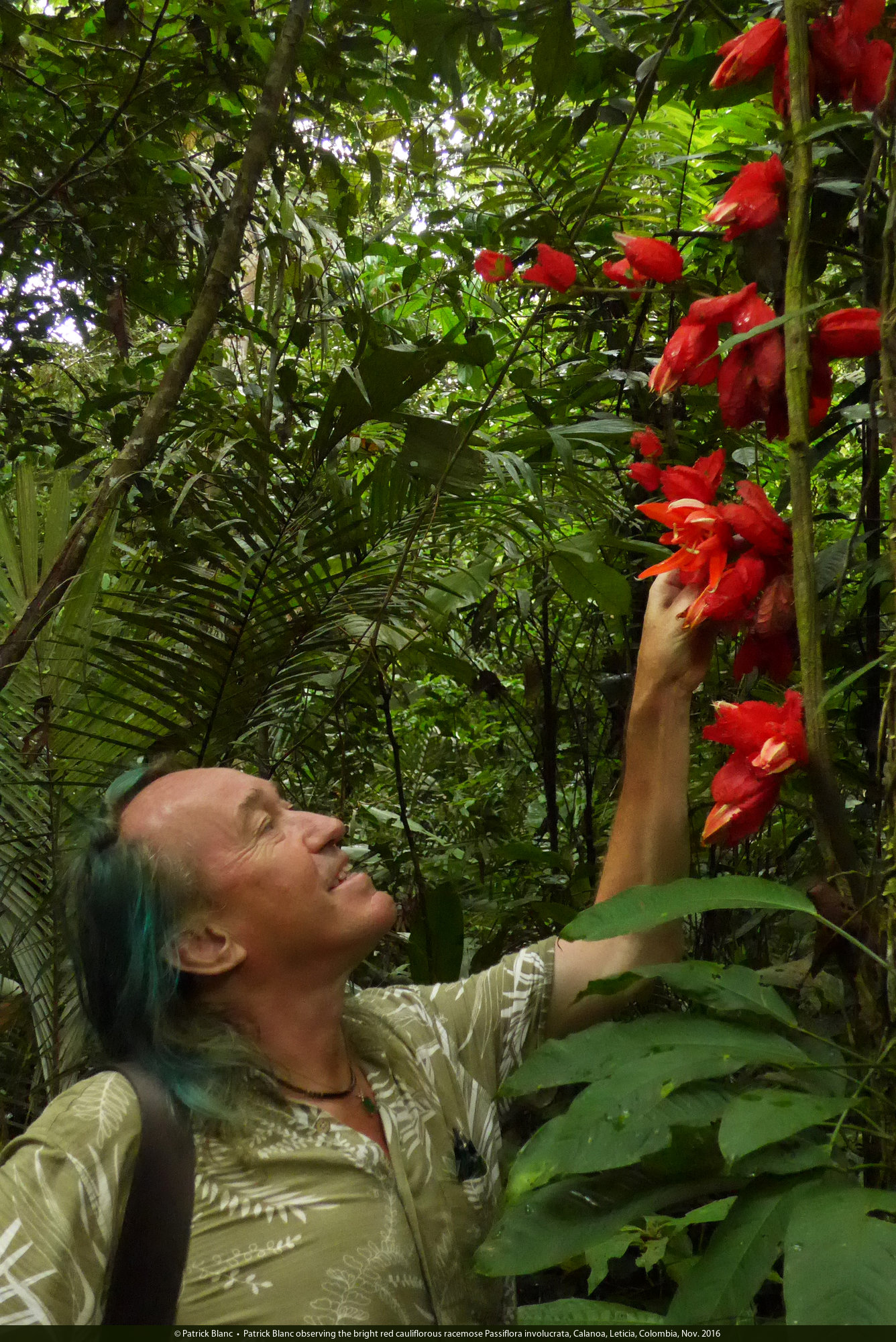 Patrick Blanc observing the bright red cauliflorous racemose Passiflora involucrata, Calanoa, Leticia, Colombia, Nov. 2016